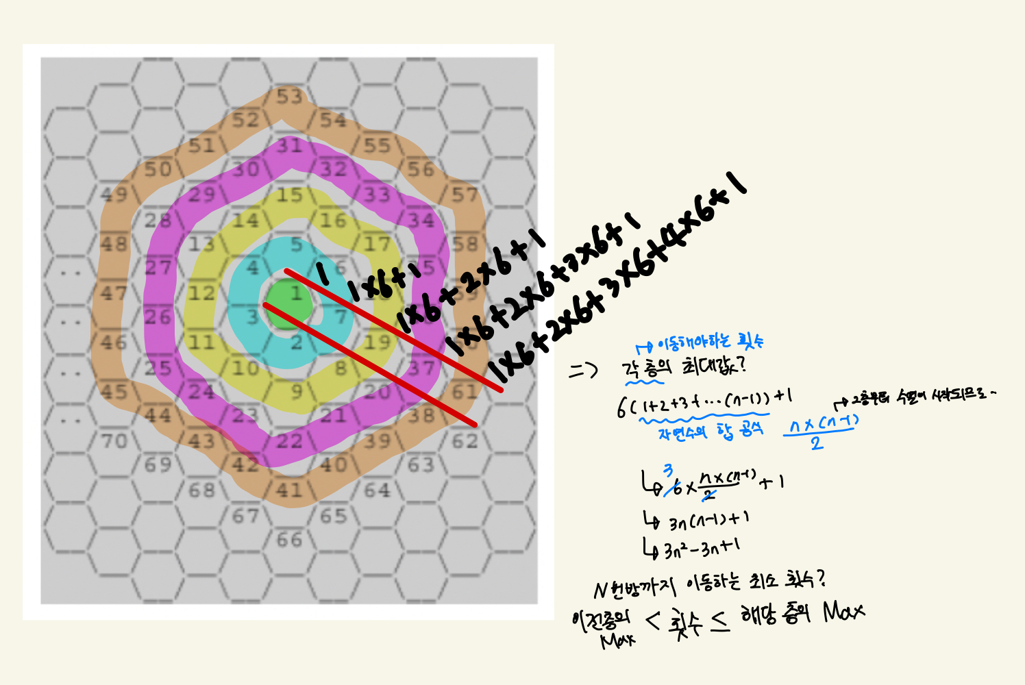 우선 해당 벌집을 각 층으로 나누었을 때 가장 큰 수가 1, 7, 19, 37 ,61인 것을 확인할 수 있다.