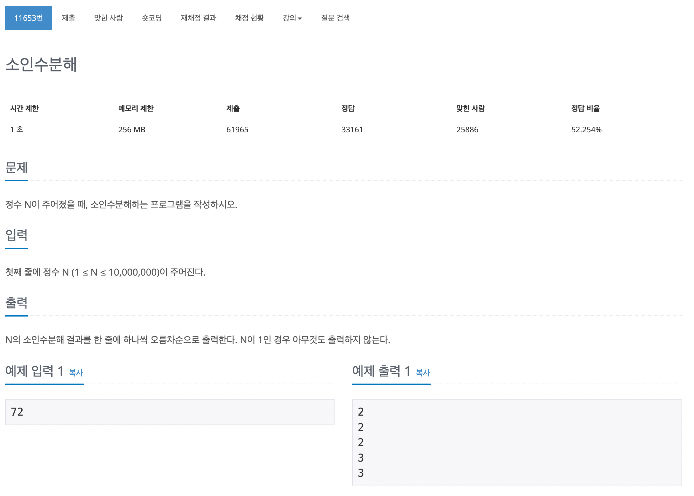 이 문제를 보고 내가 생각한 풀이 방식은 에라토스테네스의 체를 이용해 소수의 배열을 먼저 구한 뒤 그것으로 나누는 것이였는데..