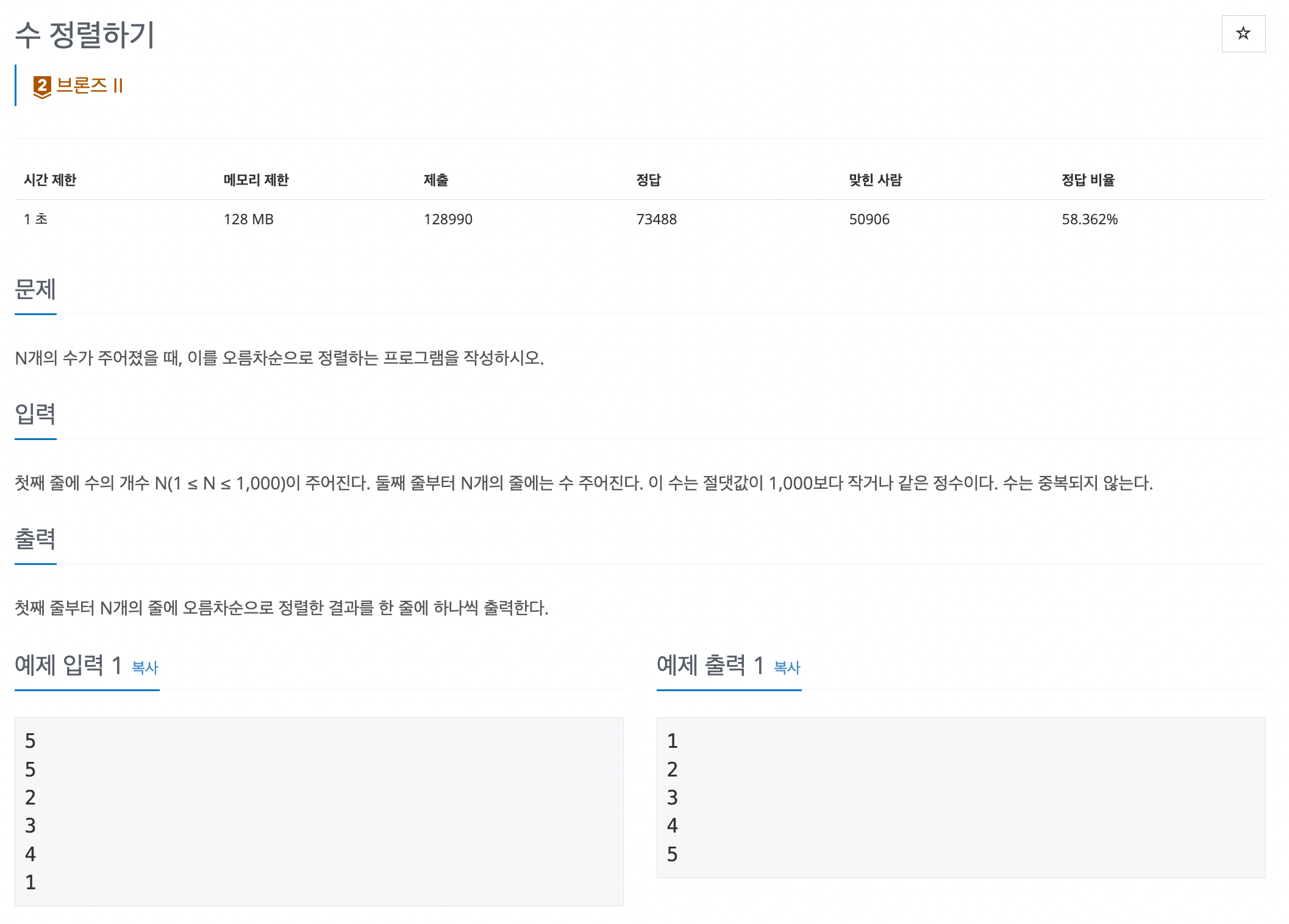 N개의 수가 주어졌을 때 해당 수의 배열을 오름차순으로 정렬하는 코드를 작성하는 문제이다.