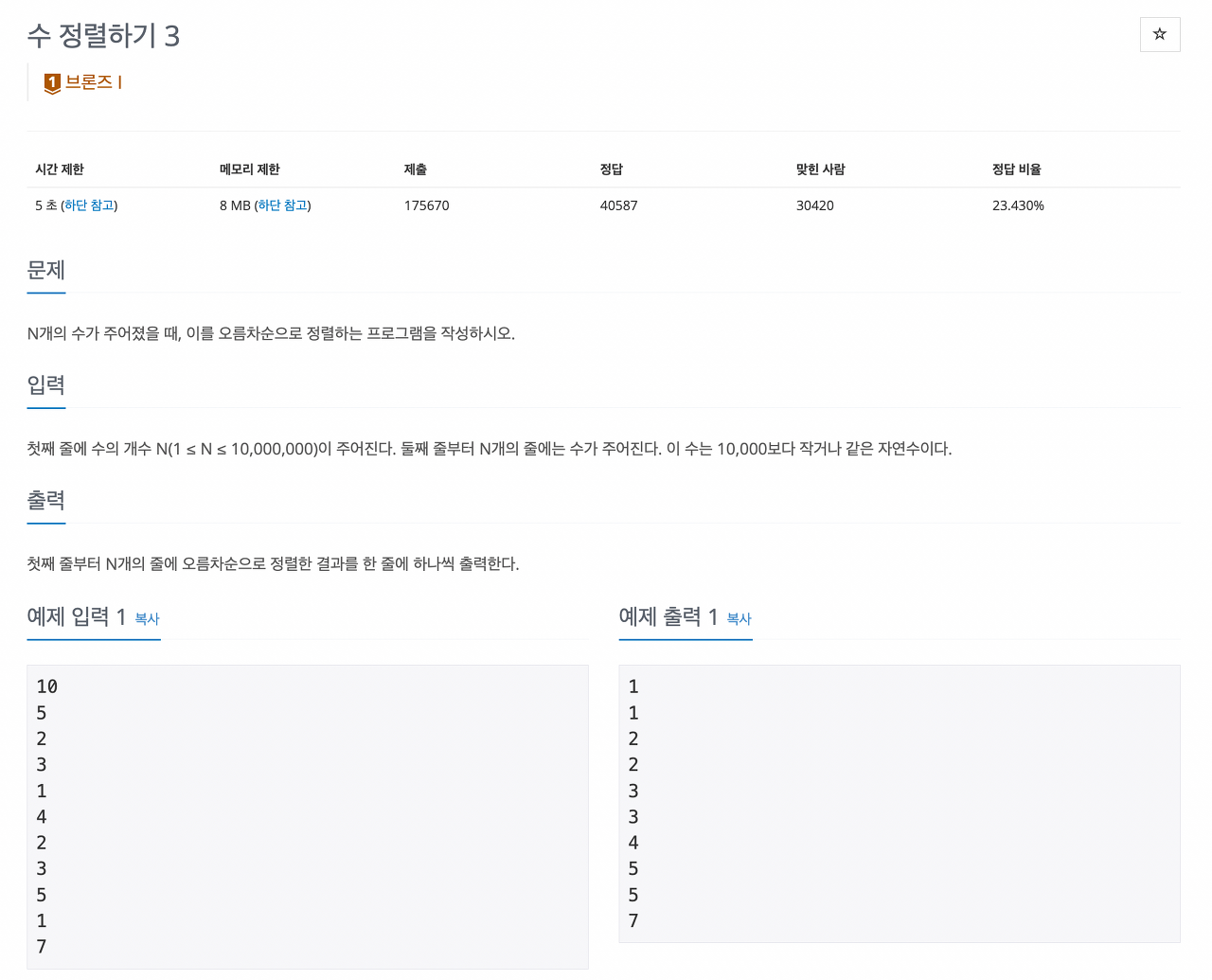 3. 그러나 사실 O(n)의 시간 복잡도는 최적의 경우일 뿐이고 최대값을 기준으로 카운트할 배열을 생성하기 때문에 시간 복잡도는 최대값에 비례해서 끊임없이 높아진다. 게다가 그만한 배열을 사용하게되니 메모리 낭비는 덤이다.