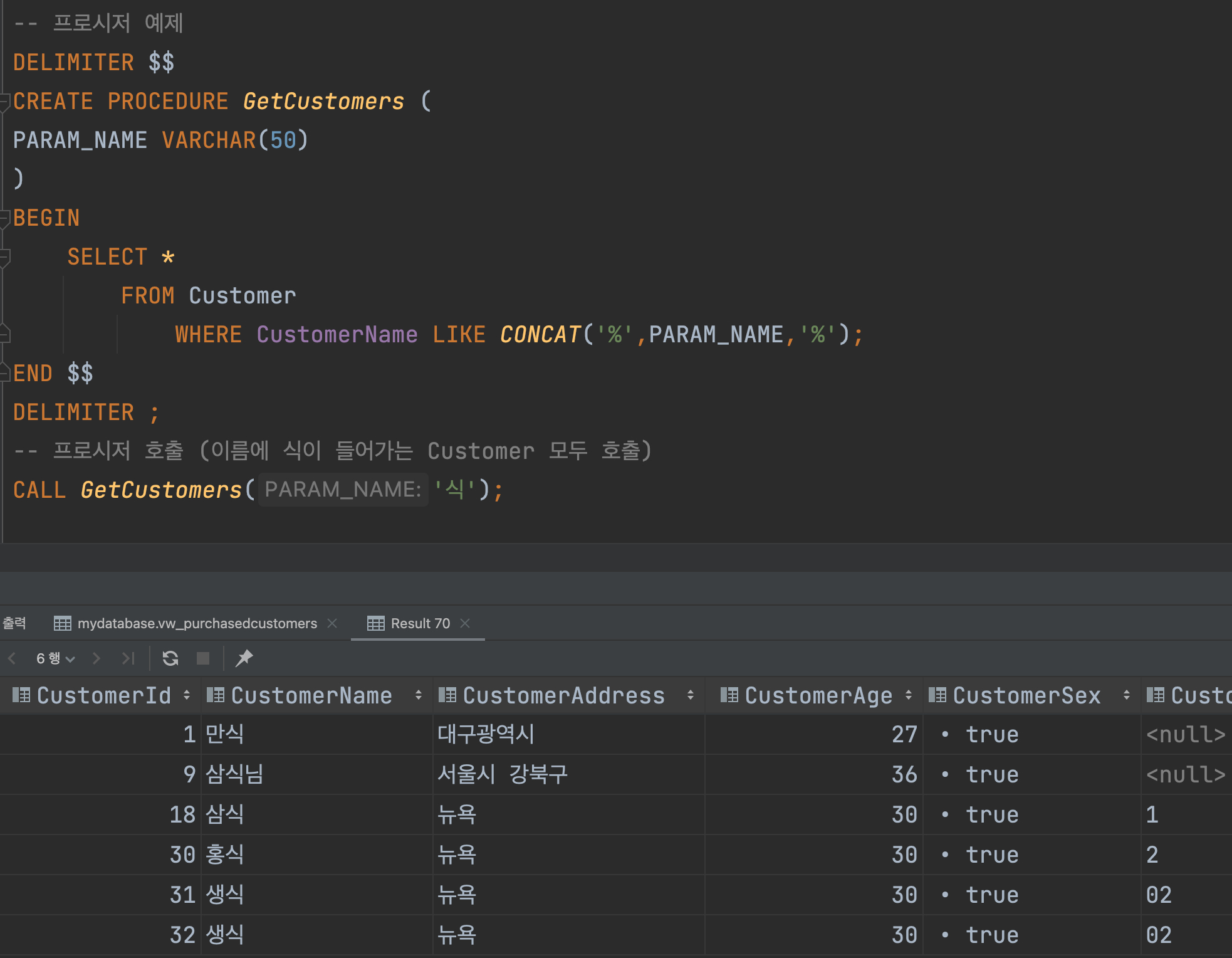 이름에 식이 들어가는 모든 Customer를 호출하는 프로시저이다.