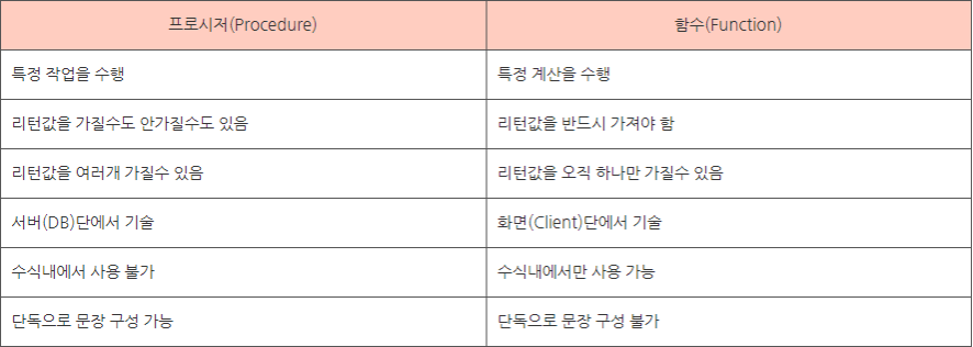 또한 Function은 반드시 한 개의 리턴값을 가지기 때문에 보통 프로시저를 보조하기 위한 연산 용도로 사용되며, 프로시저는 일련의 작업 과정 (예 : 로그인) 전체를 수행하는 목적으로 사용된다.