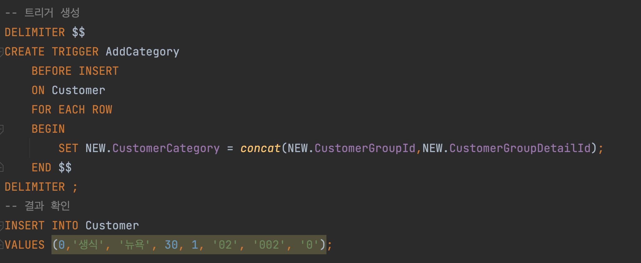 위와 같은 형태의 테이블이 있는데, CustomerGroupId와 CustomerGroupDetailId가 합쳐진 문자열이 CustomerCategory로 들어가야하는데, 이것을 매번 직접 입력하기는 귀찮아서 자동 생성되게 만들었다.