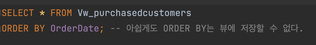 * 뷰로 쿼리를 저장하는 경우 대부분 타겟이 관계형 테이블이다. 결과를 나타내는 테이블들이기 때문에 잘못 건드렸다가는 문제가 생길 수 있다. 뷰는 오직 Read Only로만 사용할 것을 권장한다.