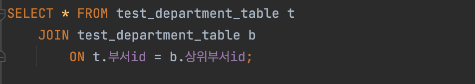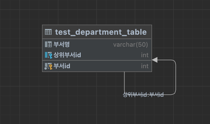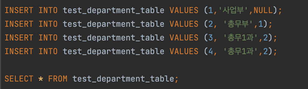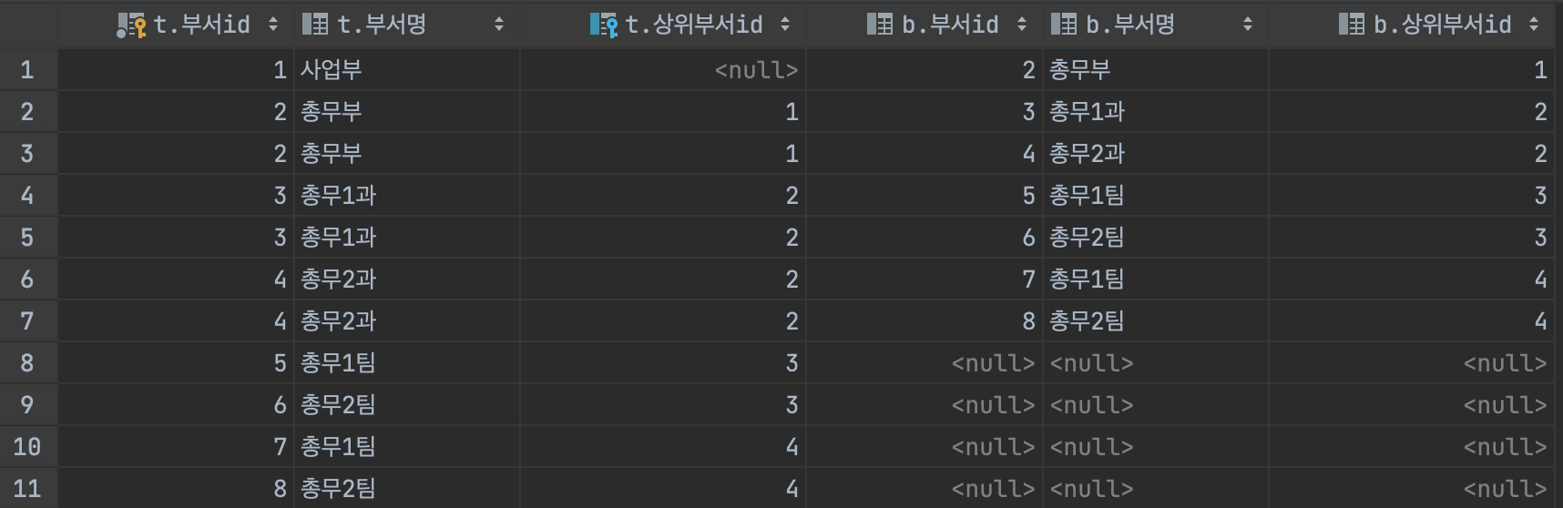 위 테이블에서 우측이 NULL이라면 최하위 부서라는 의미가 되고, 좌측(상위 부서)이 NUL이라면 최상위 부서라는 의미가 된다.