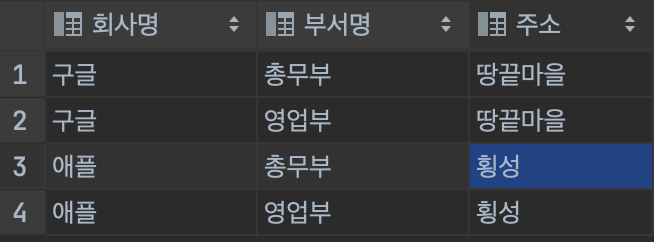 각 회사의 데이터가 들어가는 테이블이 있고, 회사의 부서들이 들어가는 테이블이 있다.