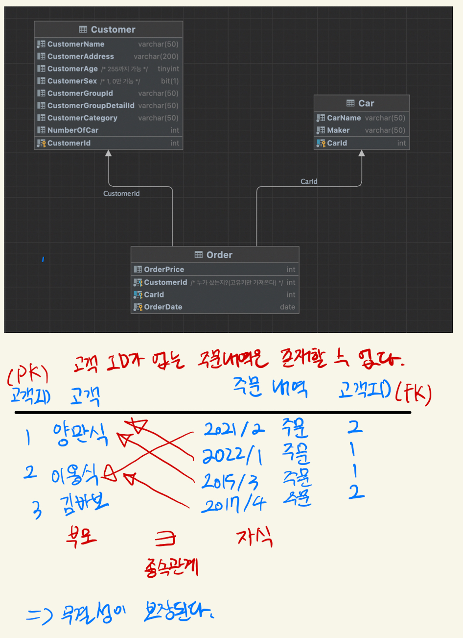 이 때 Order는 Customer에게 종속되었다고 표현하며, 이러한 종속 관계로 무결성을 보장할 수 있다.
