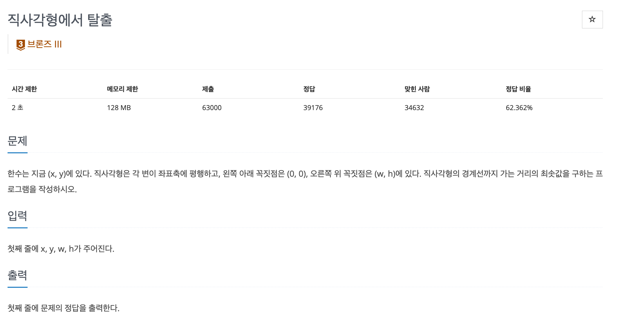 현수가 있는 좌표인 x,y에서 경계선까지 가는 최단거리는 y, x, h-y, w-x 중 하나일 것이다.