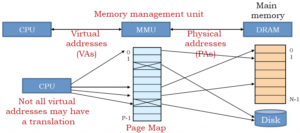 이를 해결하기 위해 MMU는 가상 메모리와 물리 메모리를 매핑해주기 위해 (가상 주소 : 페이지가 위치한 실제 주소)의 형태로 Page table에 연속적으로 배치하여 프로세스 입장에서는 연속적인 메모리상에서 코드가 실행되고 있는 것처럼 보이게 만들어준다.