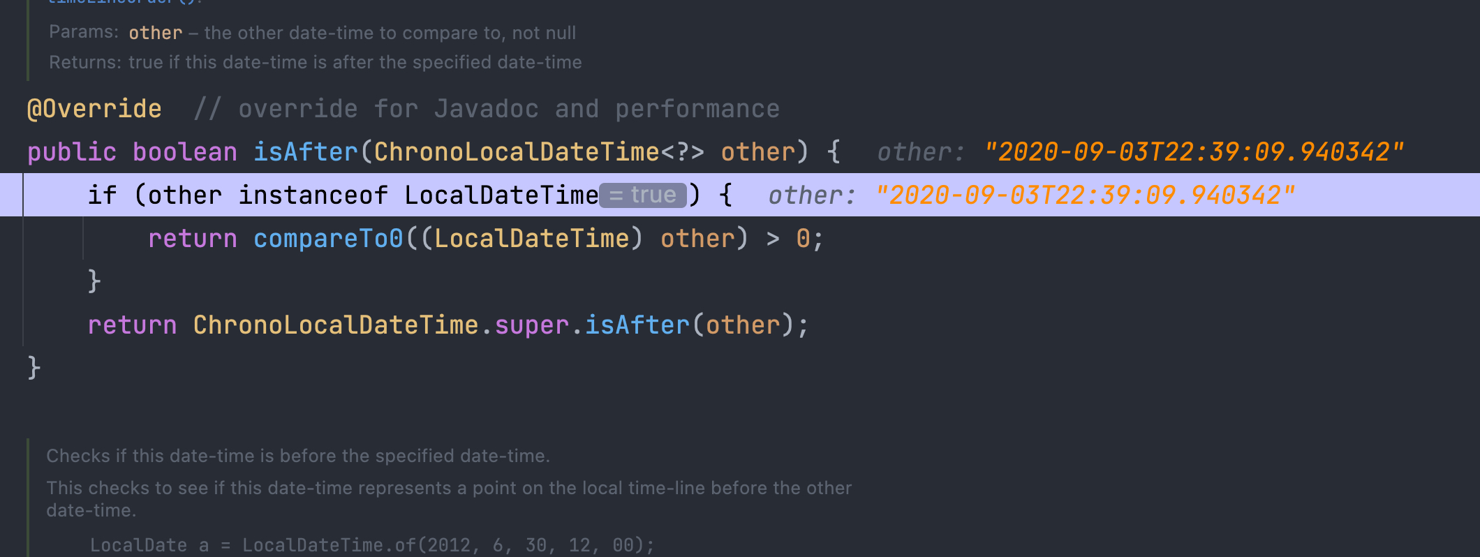 LocalDateTime으로 바꿔주고 다시 디버깅해보니 정상적으로 비교하고 있는 걸 확인할 수 있다.