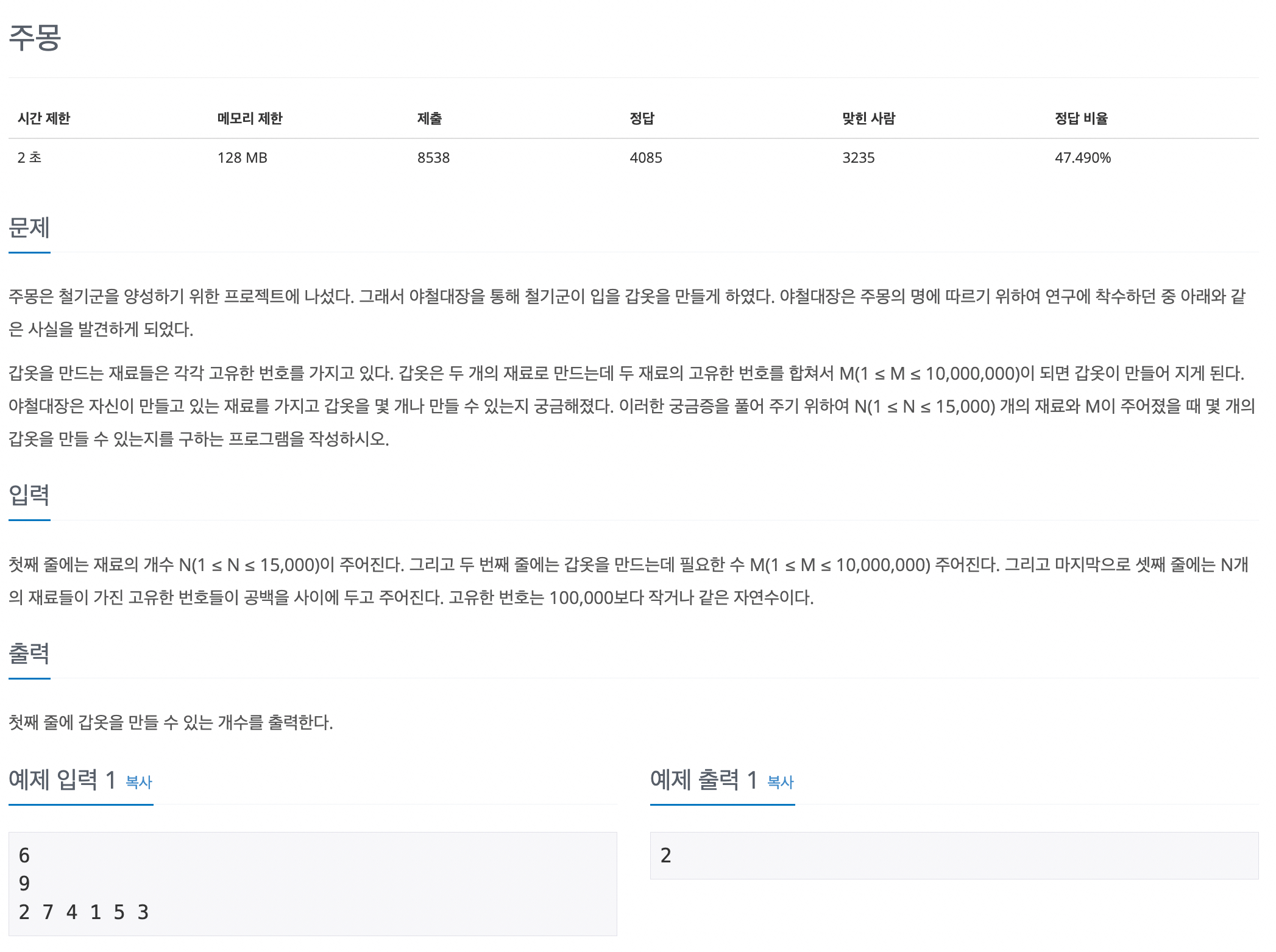 1 <= N <= 15,000개의 자연수와 두 개의 합으로 구해야 하는 값 M이 주어진다.