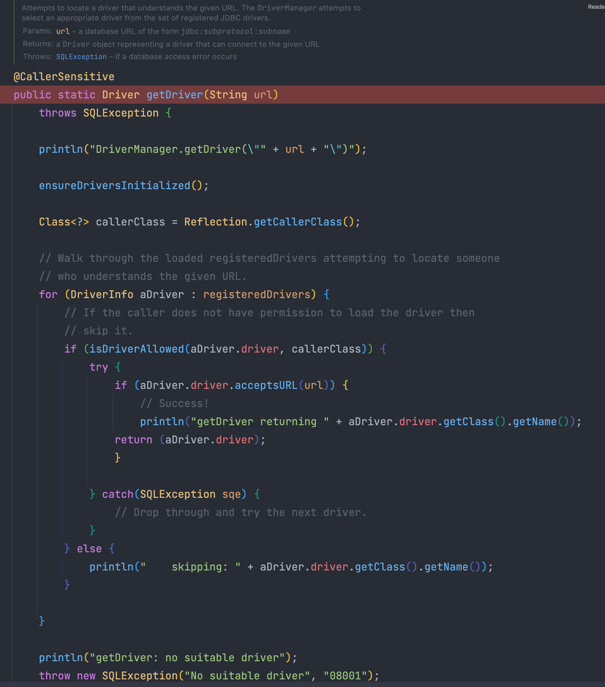 이 메서드는 DriverManager 클래스 내부에 존재하는 메서드로, 어플리케이션 실행 시 jdbc.driver 경로에 위치한 모든 드라이버에게 각 url을 대입해서 적절한 드라이버 구현체를 찾고, 이후 여러 로직을 거쳐 Connection을 반환하게 한다.