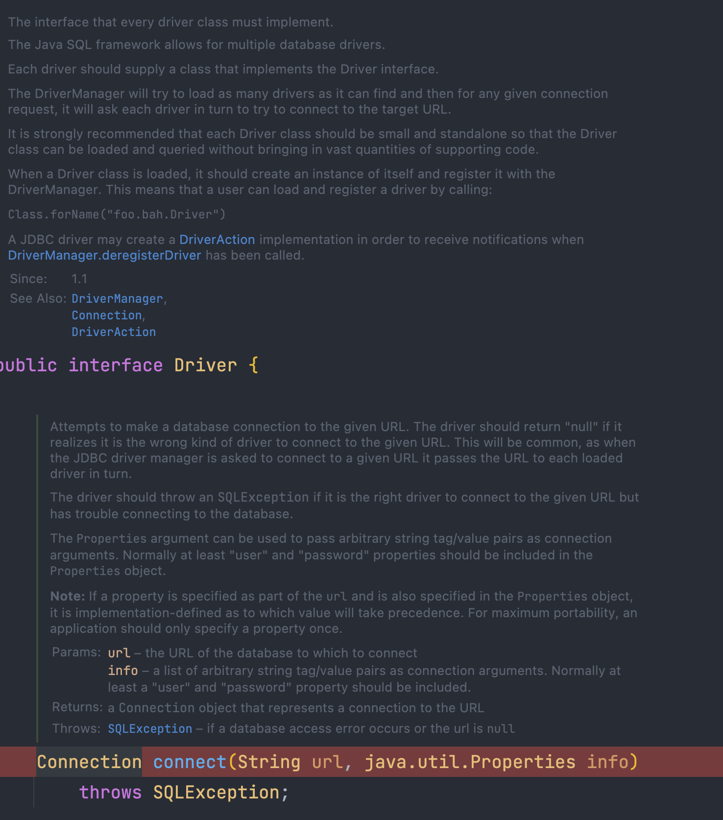 String 타입의 url과 java.util.Properties타입의 info를 인자로 받아서 connect해서 Connection 객체를 반환하는데, 이것은 database를 연결할 url과 데이터베이스 접근에 필요한 user,password를 의미한다.