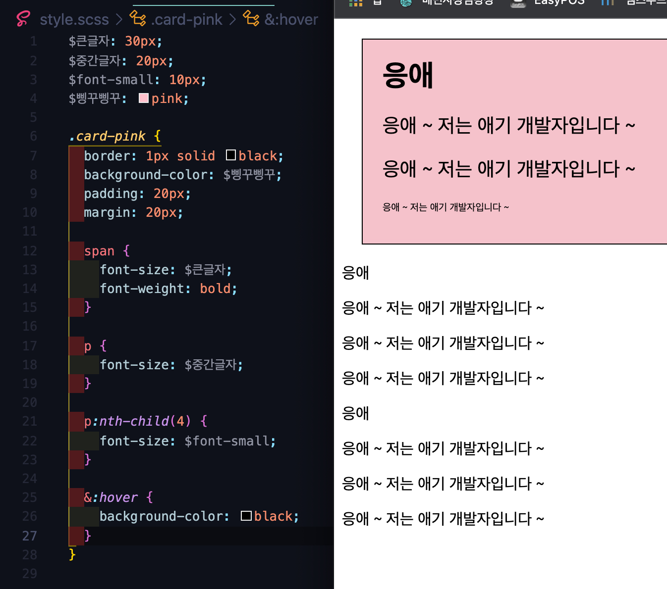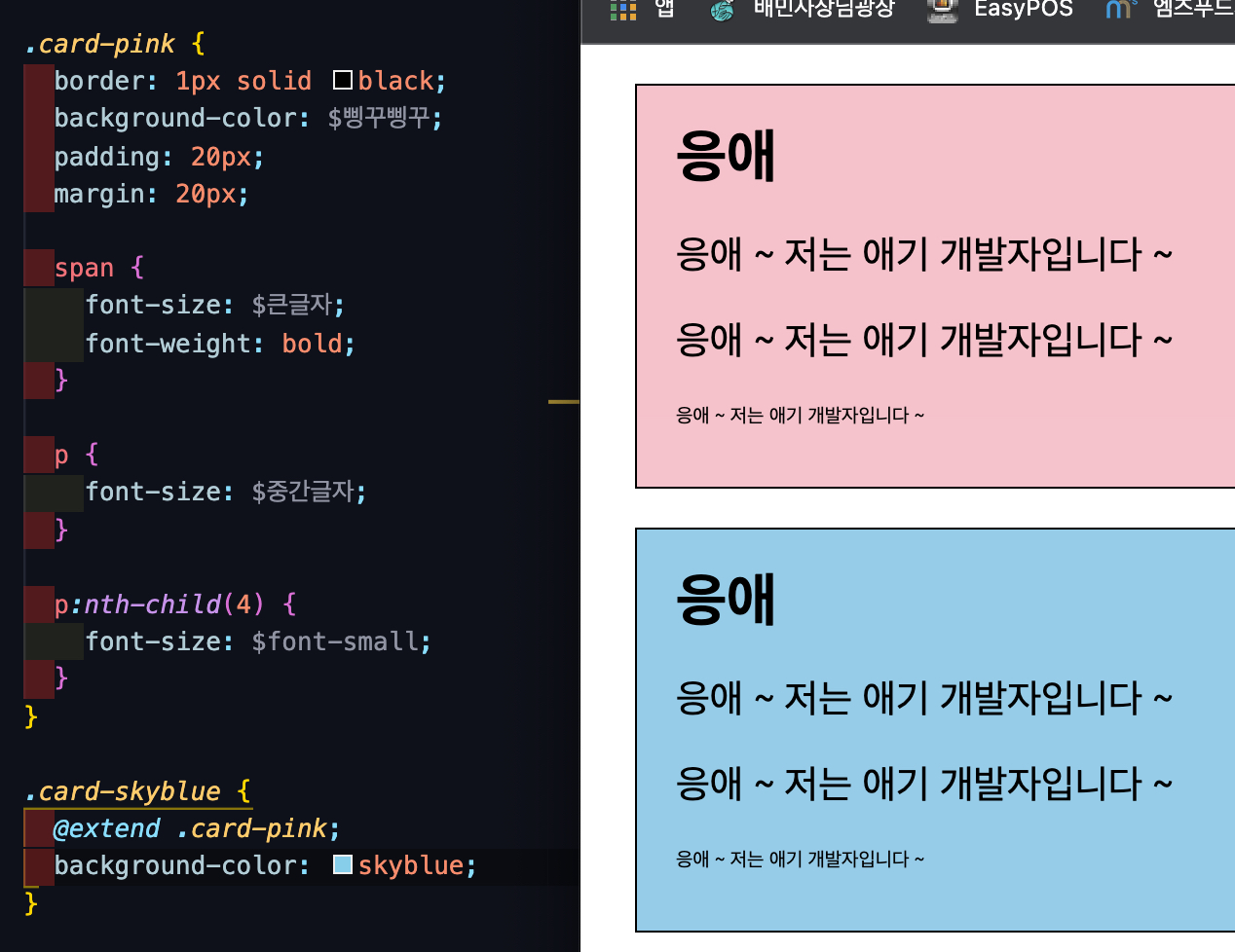 css의 root 활용과 비슷하게 $변수명을 사용하여 미리 입력된 값을 불러와 사용할 수 있다. 다만 훨씬 눈에 잘 들어오고 깔끔하다.