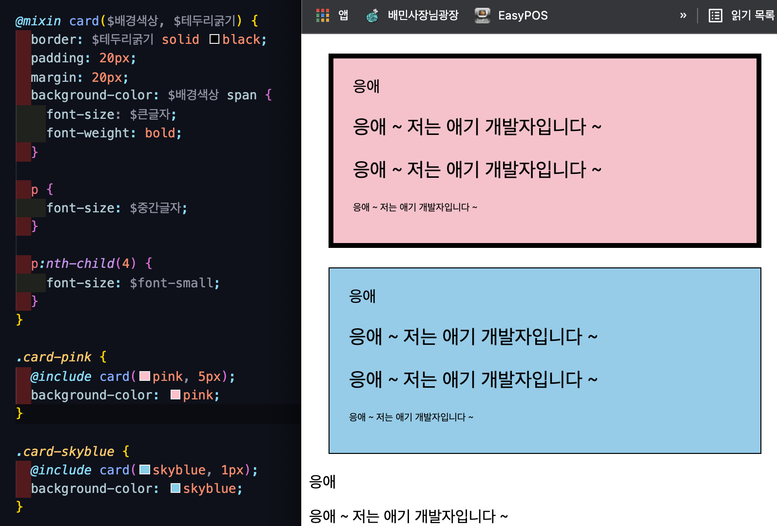 다음은 mixin이다. extend와 다른 점은 파라미터 위치를 지정해두고 변경해가며 사용할 수 있다는 것이다.