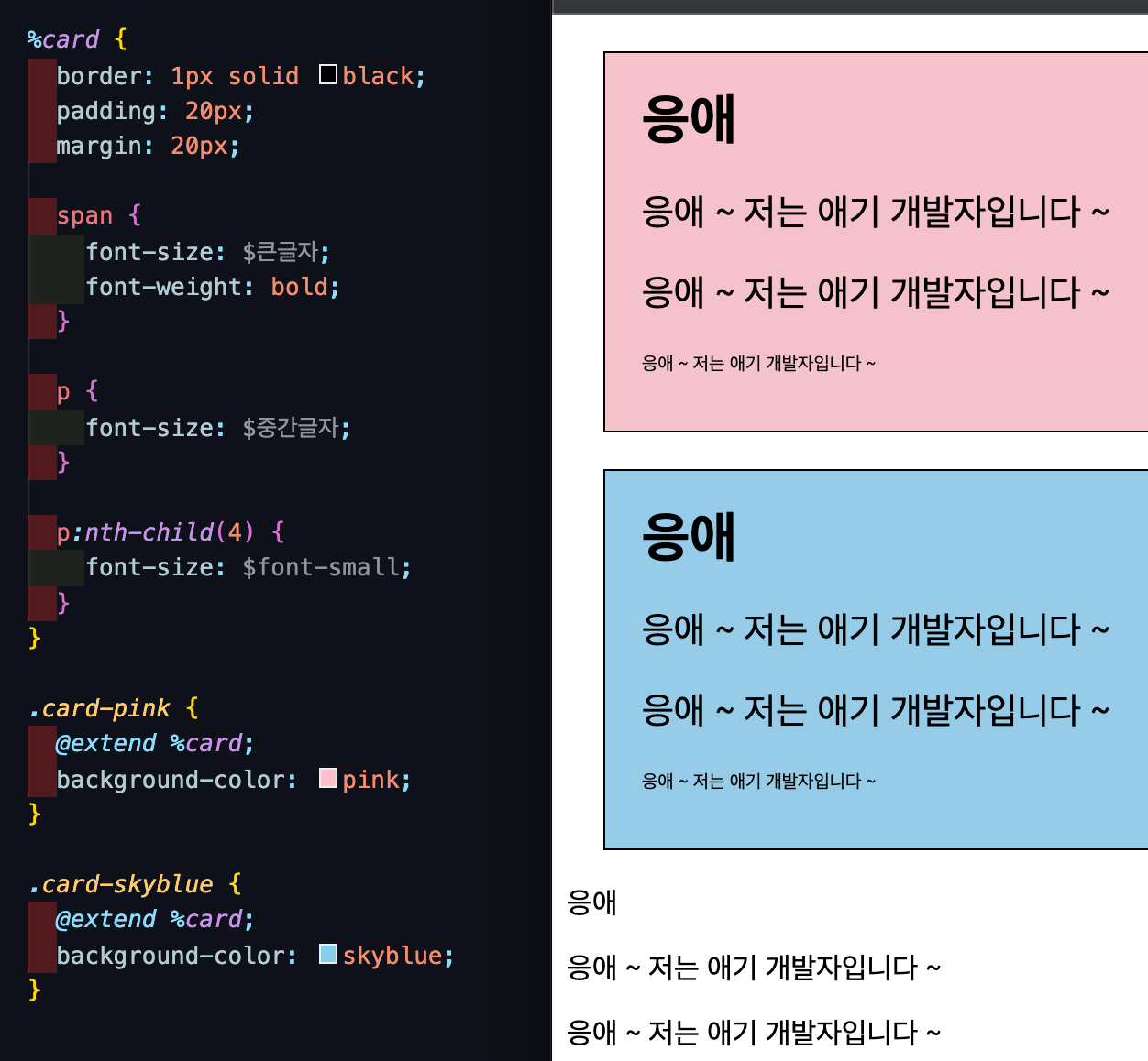 우측의 스크린샷에 보이는 것처럼 실제로 존재하지 않는 %card라는 가상 클래스에 미리 공통된 값을 적용해준 뒤 실존하는 클래스에 불러와서 사용하는 것이다.