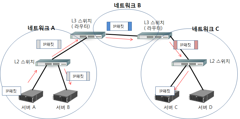 IP 패킷 헤더에 포함된 IP 주소의 정보에 기반하여 패킷을 전송한다.