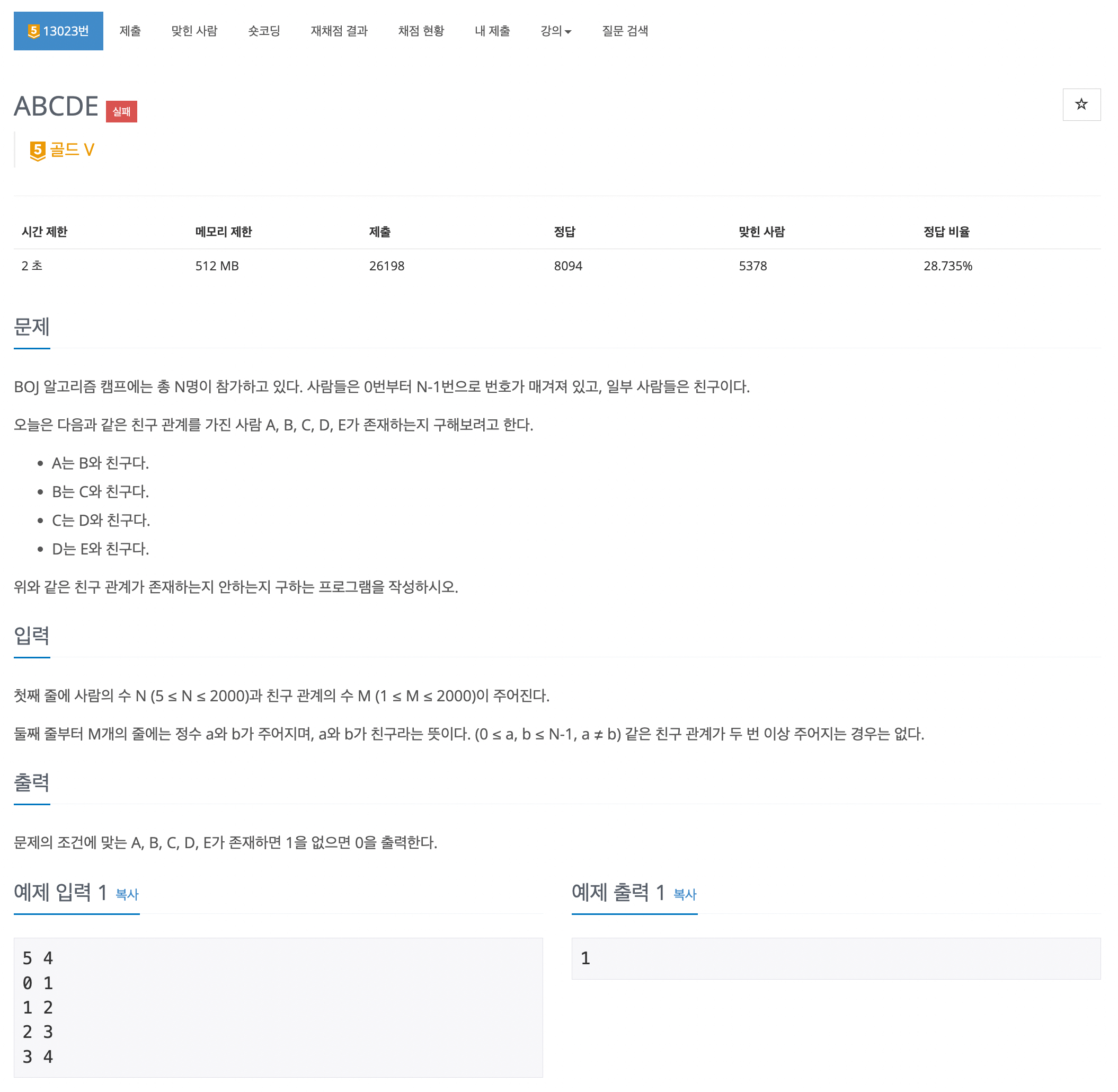 // A,B,C,D,E가 한 번에 이어지는 경우를 찾아야 한다 -> DFS