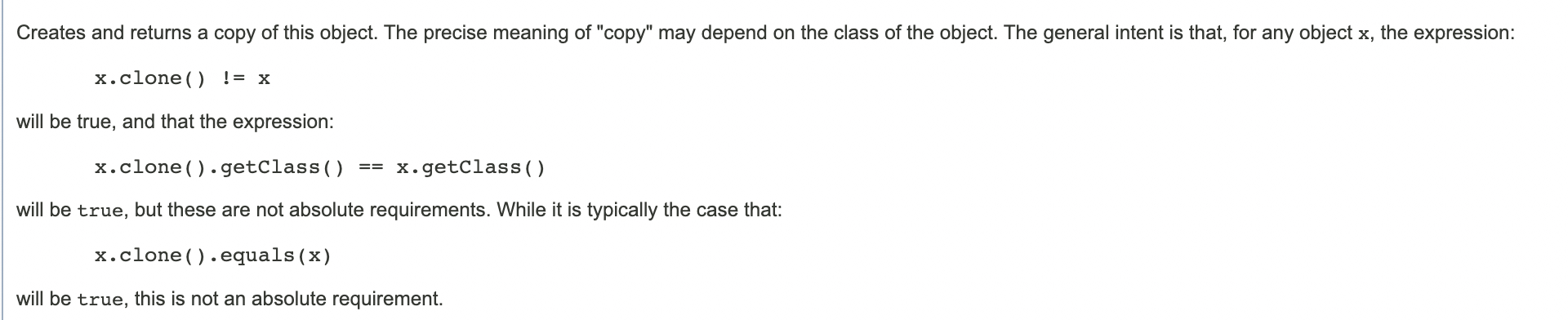 Instead, it says something about what it can do internally. It says that if by calling super.clone repeatedly it ends up calling Object's clone method, this method will return a field copy of the original.