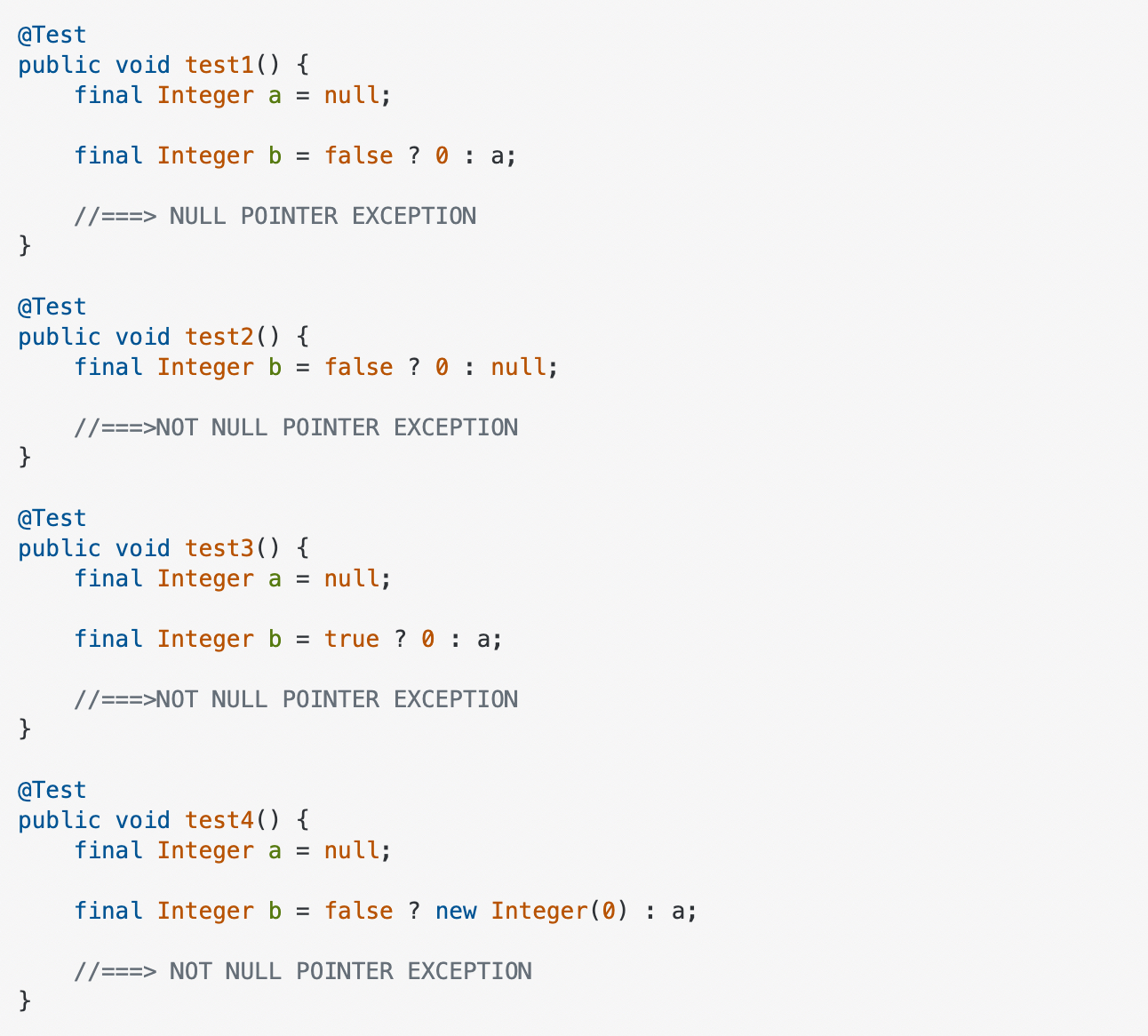 삼항연산자에서 비교를 위해 둘 중 하나가 primitive type이면 나머지 하나도 primitive type으로 비교하려고 하는데, Integer 내부에 null이 있으니 int형으로 비교할 수 없어 NullPointEception이 발생하는 것이다..