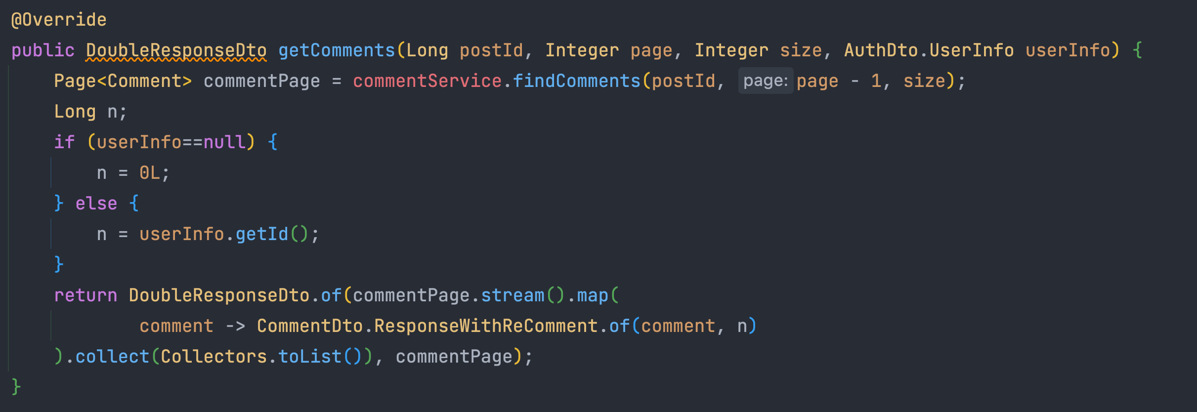 주목해야할 부분은 UserInfo.getId()이며, 우리는 해당 부분을 별도로 테스트를 분리했기 때문에 저 부분은 테스트 시에 늘 Null이 들어가며, Null이 들어가도 문제가 없는 로직이다.