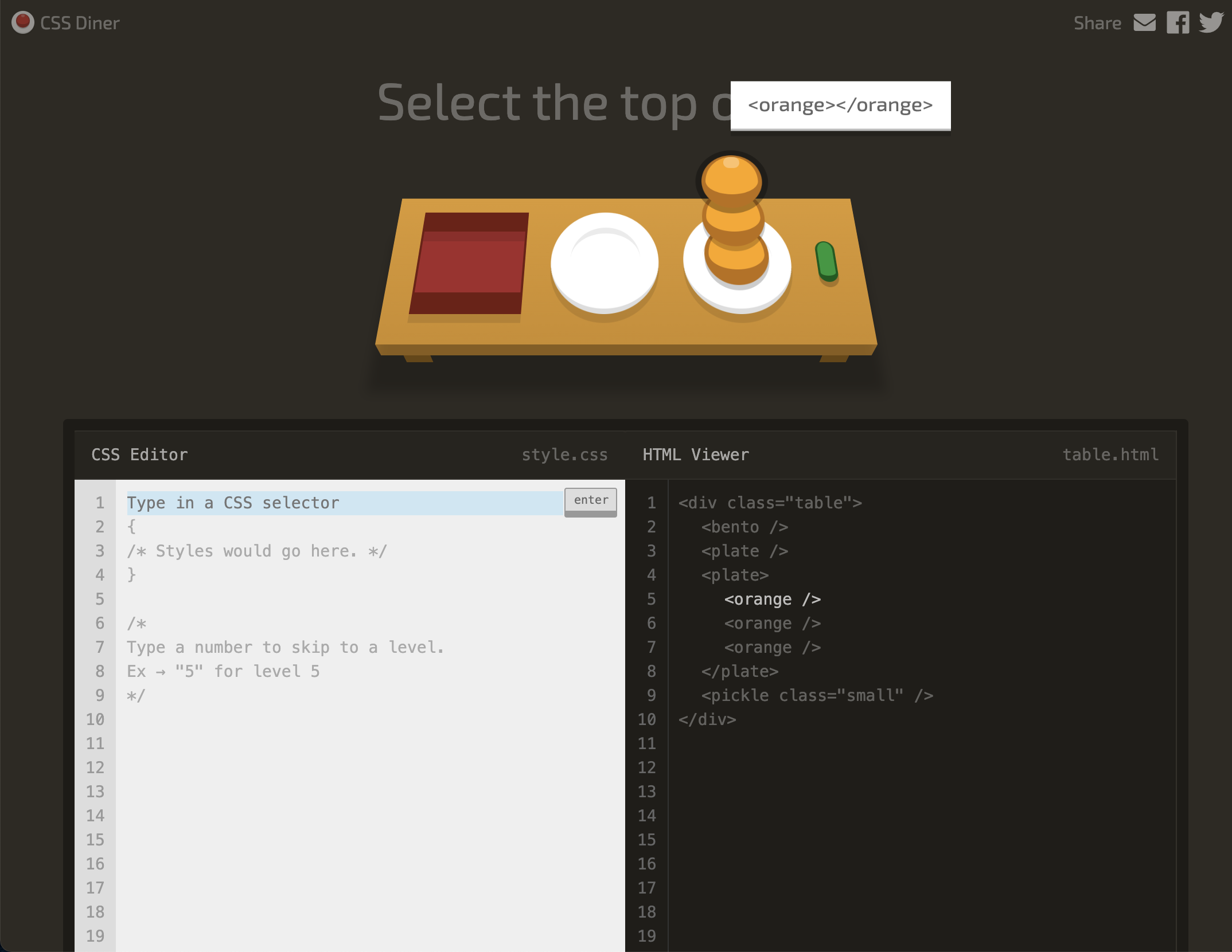 자식 요소인 orange 중 첫 번째 자식 요소인 orange를 선택하는 문제.(해당 문제에서는 plate 하위 요소에만 속해있으나 여러 하위 요소가 있을 경우 다른 하위 요소에서도 첫 번째 자식 요소에 orange가 있다면 선택된다.)