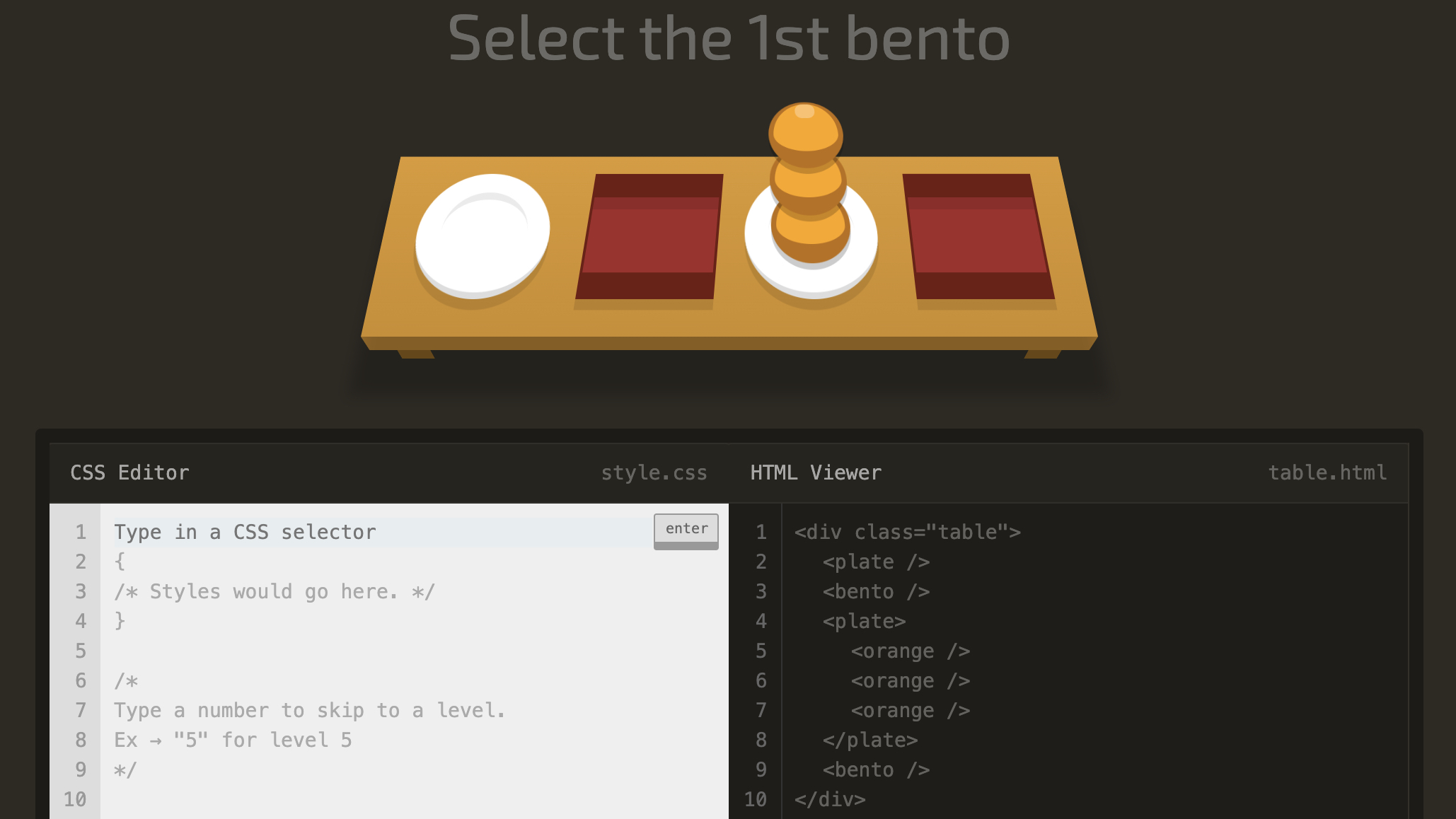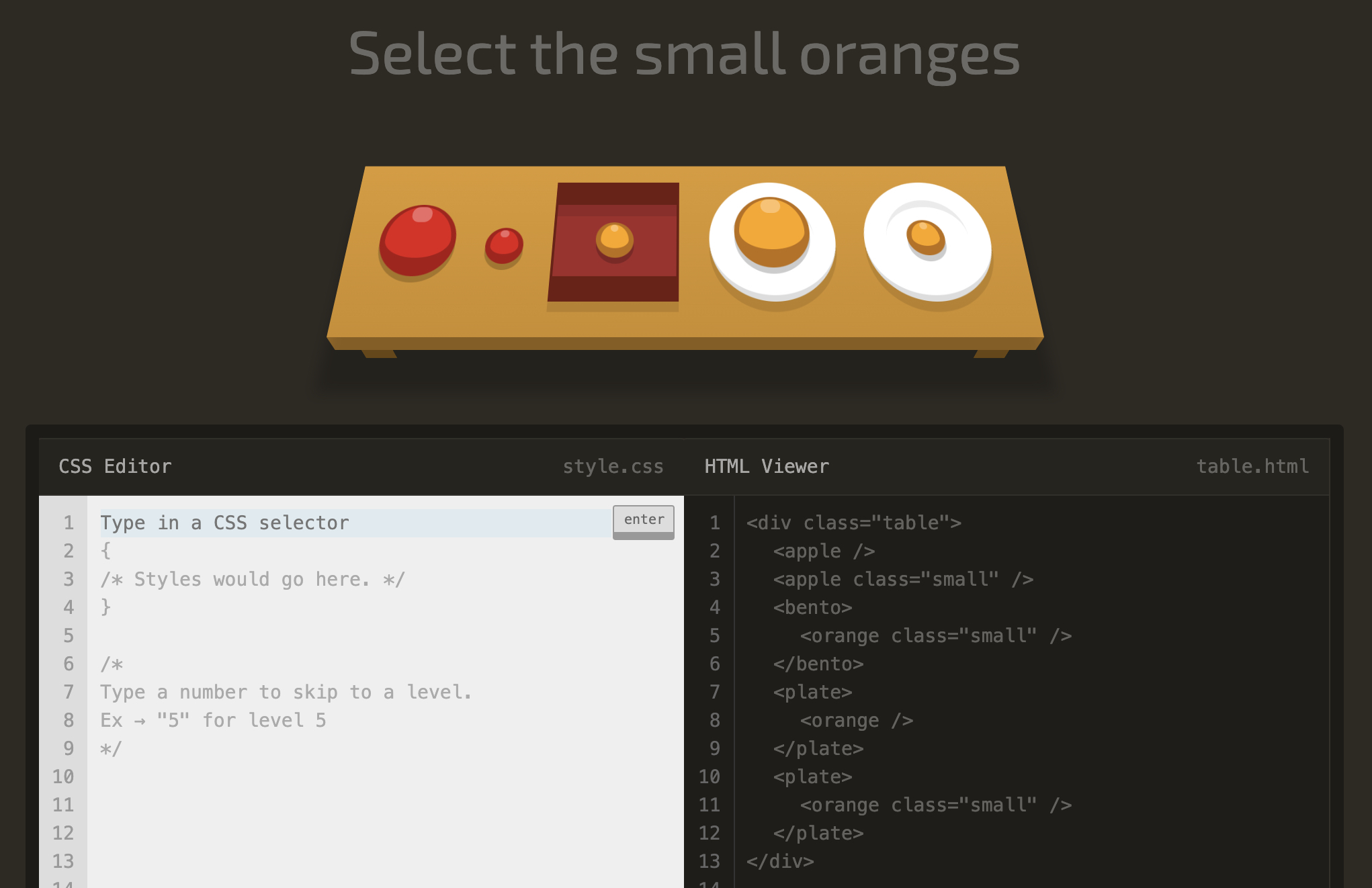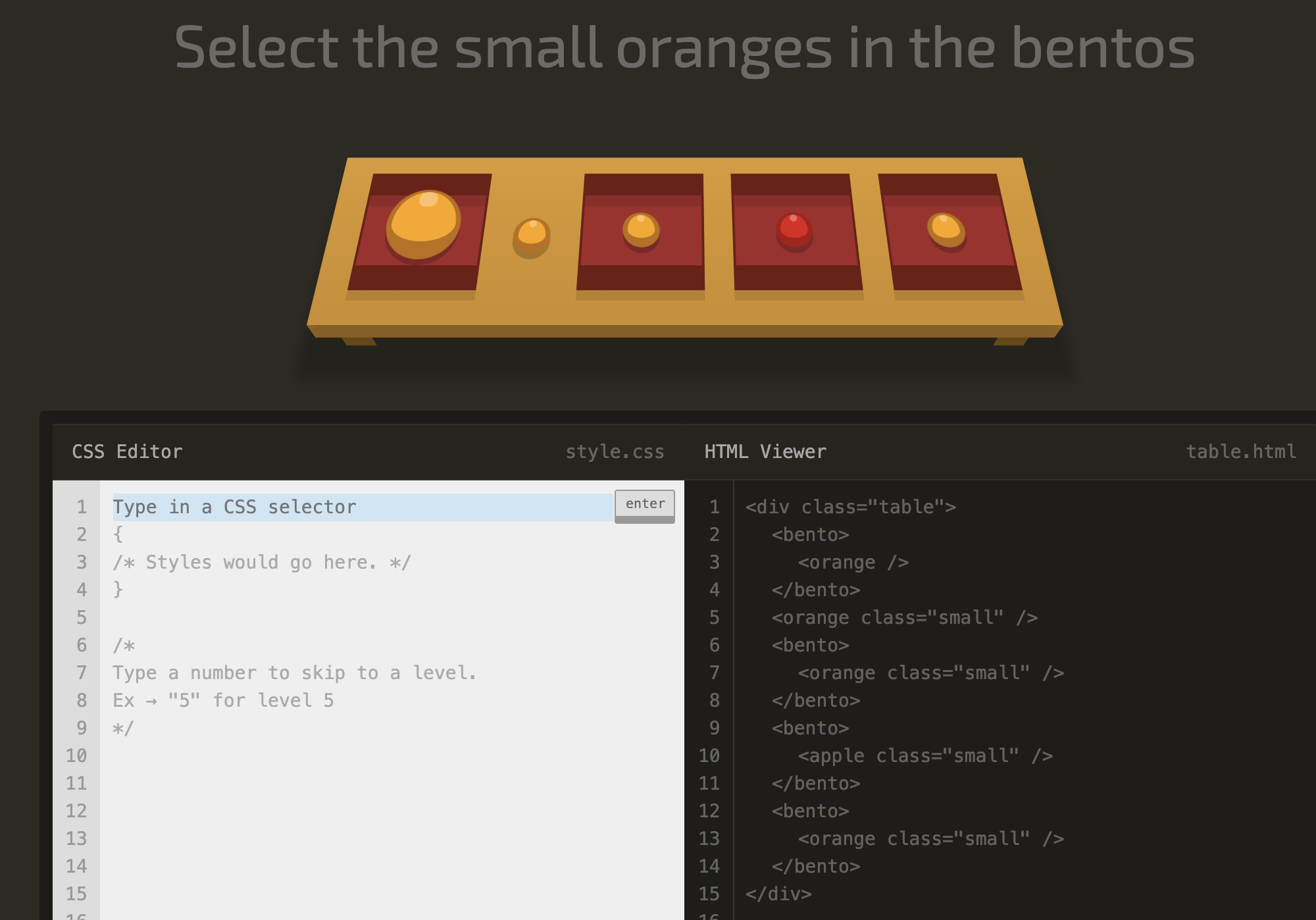 <bento>라는 하위 요소 안에 속해 있는 자식 요소인 <orange /> 중 <orange class="small" />만을 선택하면 된다.