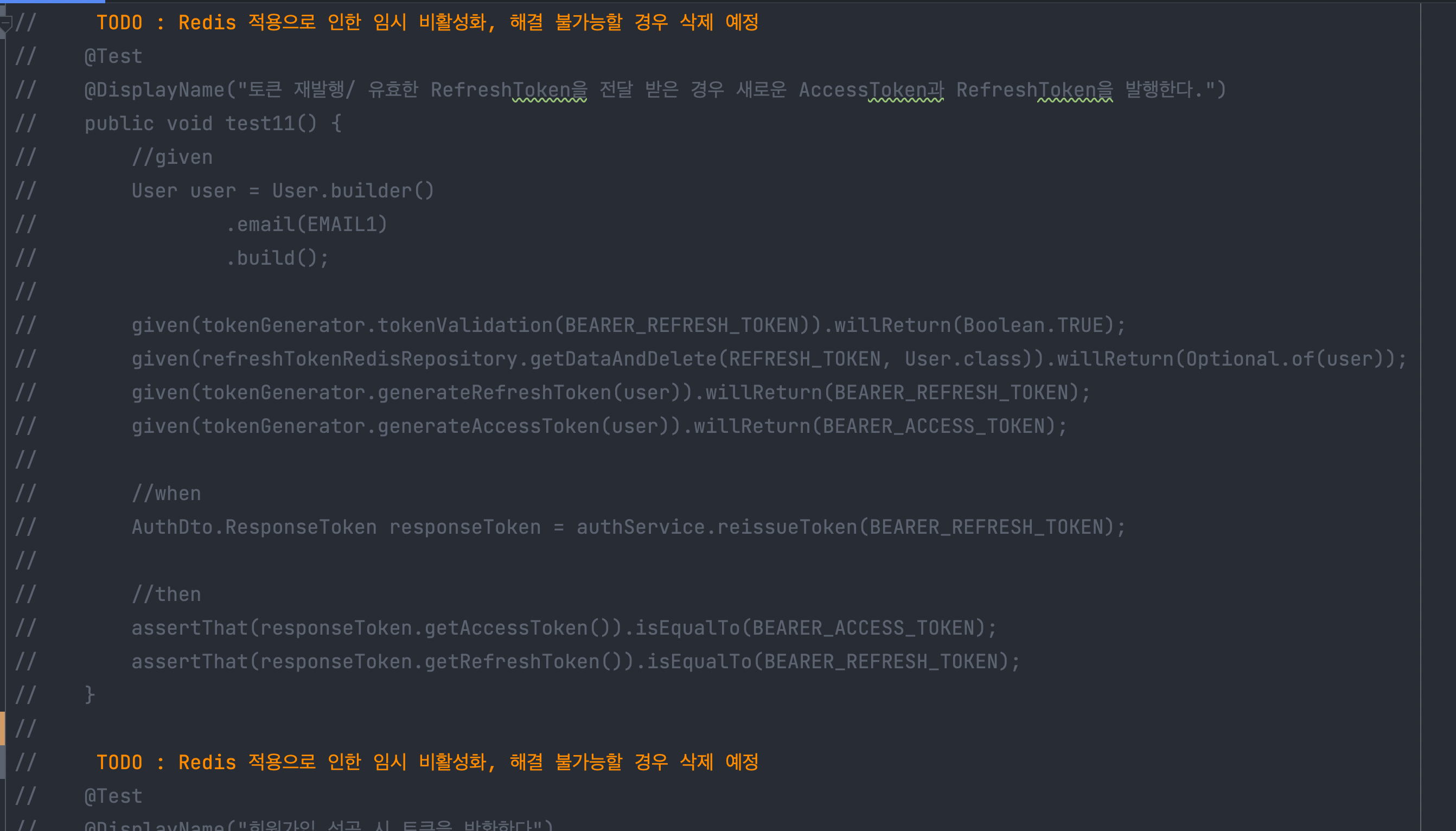 이제 레디스가 비어있는 경우를 테스트하고 싶다면 REDIS_AUTH_KEY_EMPTY 같은 미리 등록해놓은 상수를 쓰면 되고, 반환값이 있는 경우를 테스트하고 싶다면 REDIS_AUTH_KEY 이런 거 쓰면 된다.