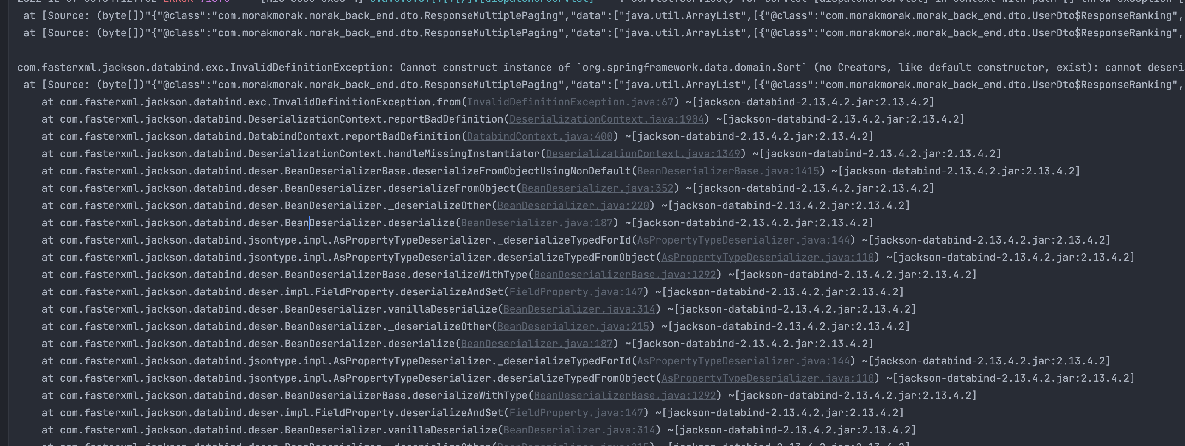 이 중 LocalDateTime 때문에 망하는 건 쉽게 해결할 수 있으나, Page 객체로 인해 터지는 문제는 하나하나 일일히 TypeReference를 지정해주던지, 아니면 PageImpl 객체를 상속 받아서 우리가 JsonProperty를 지정해주던지 해야하는데.. 우리 프로젝트에는 이 Dto를 사용 중인 서비스가 너무 많아서 그랬다간 대참사가 일어난다.