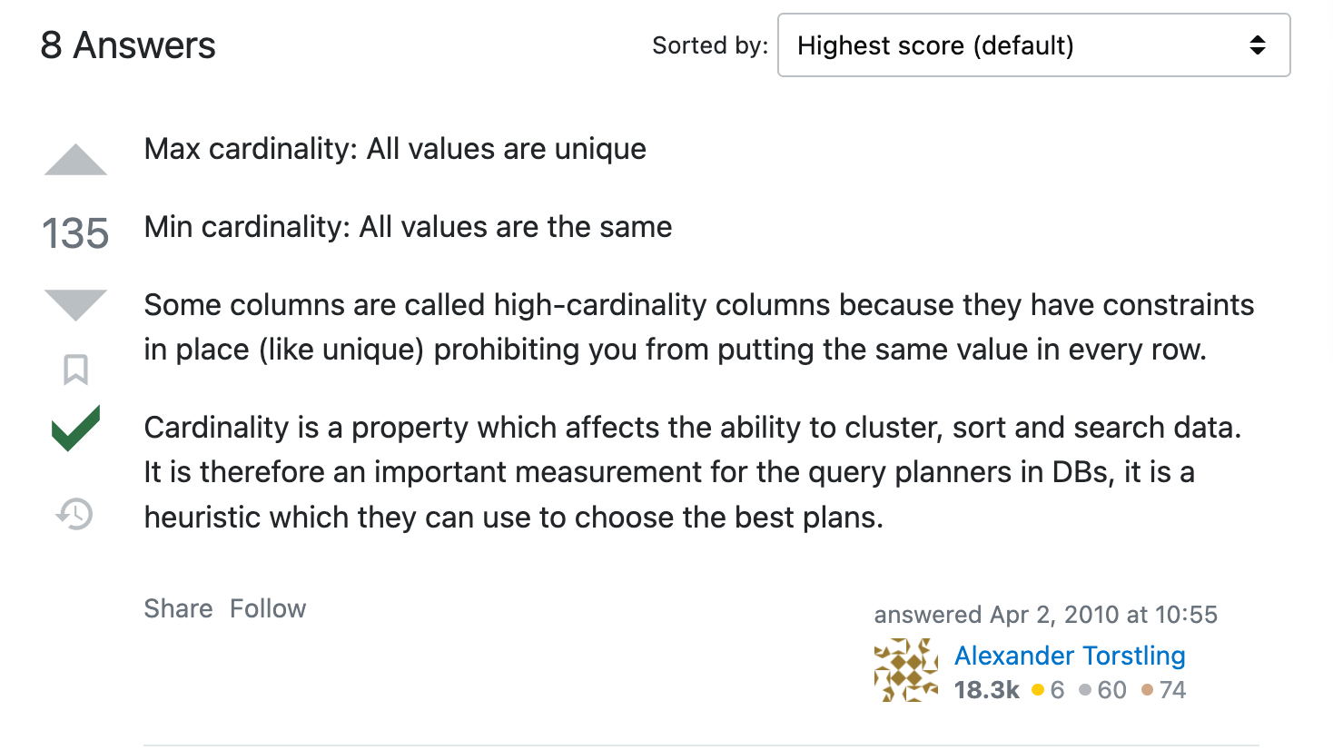 즉, Unique Index 혹은 Primary Key로 지정된 Column은 Max-Cardinality를 가지게 된다.