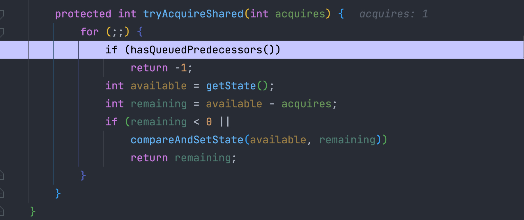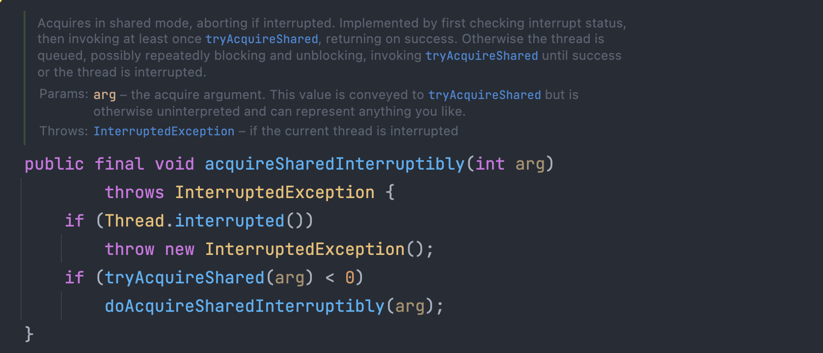 이후 acquire()를 호출하면 내부적으로 acquireSharedInteruuptibly()를 호출하는데, 여기서 Thread의 interrupted를 체크하고 세마포 값을 확인한다.