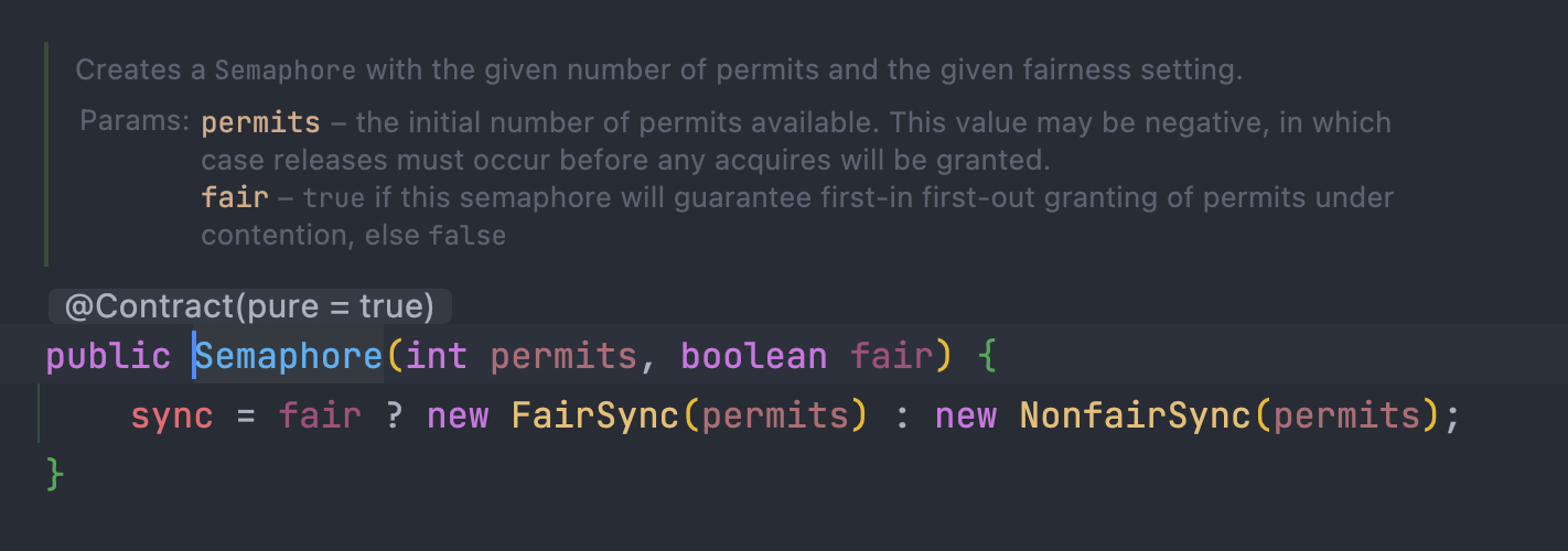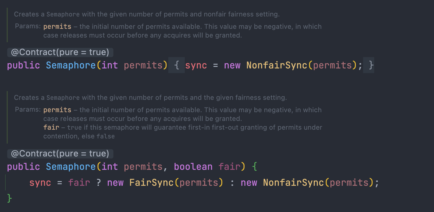 permits는 세마포어의 기본 특성인 N개까지의 쓰레드를 동시에 임계구역에 입장할 수 있도록 설정하는 것이고, fiar는 Thread가 입장 순서에 맞춰서 처리되는 것을 보장해줄지 말지에 대한 여부이다.