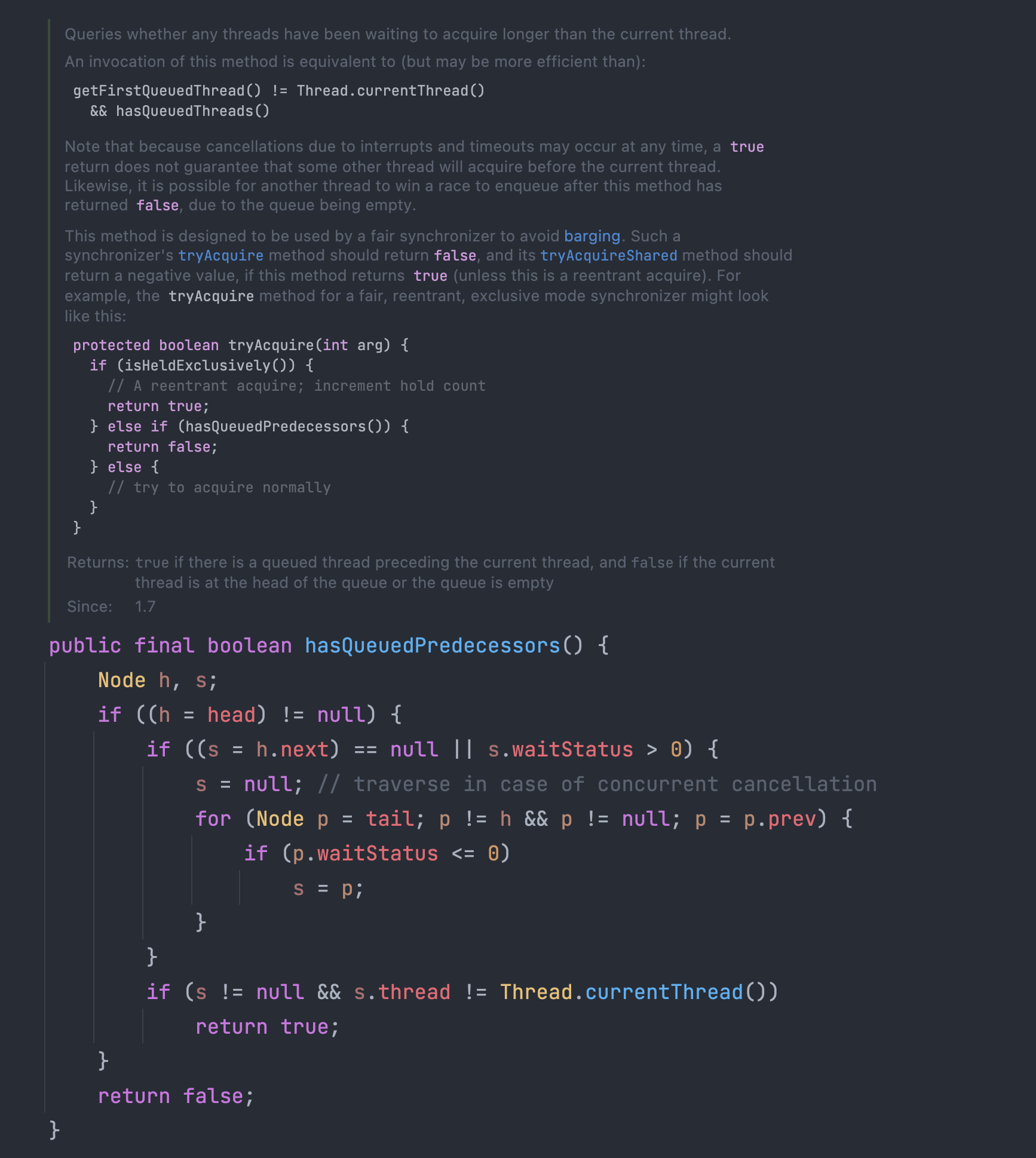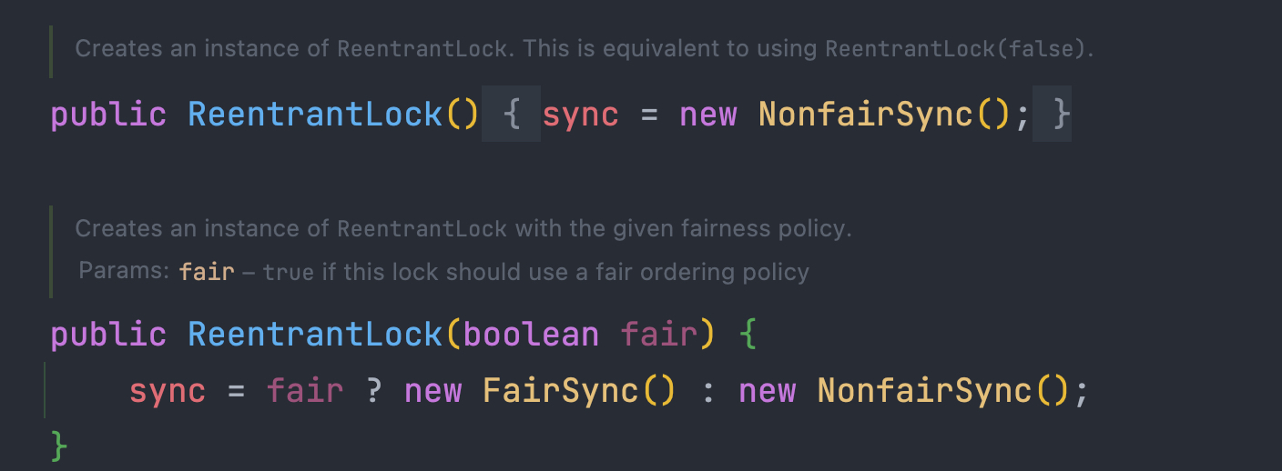 마찬가지로 ReeentrantLock 또한 두 가지의 생성자를 가지고 있으며, fair를 true로 설정할 경우 sync에 FairSync() 인스턴스를 가지게 되어 공정성을 보장한다.