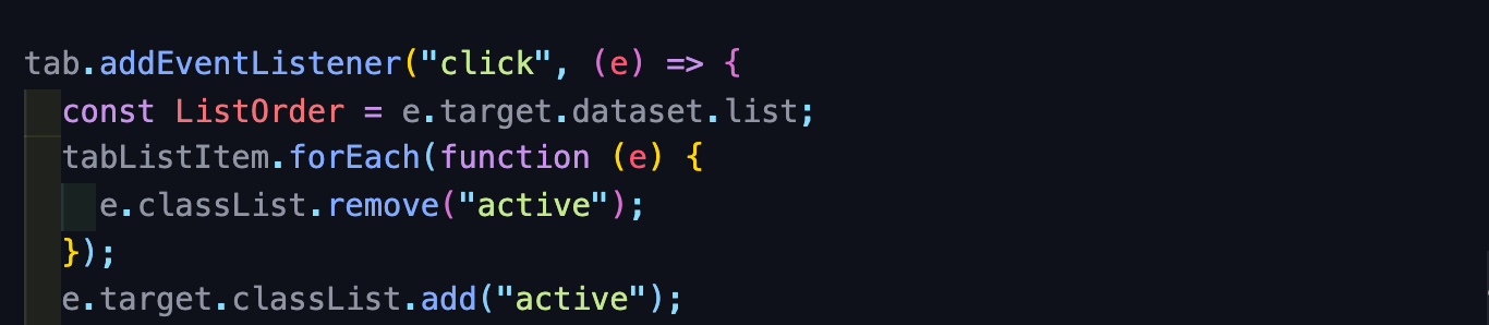 먼저 tabListItem의 배열을 빙글빙글 돌며 모든 항목의 active를 제거하고 내가 실제로 클릭한 항목에만 active 클래스를 부여한다.