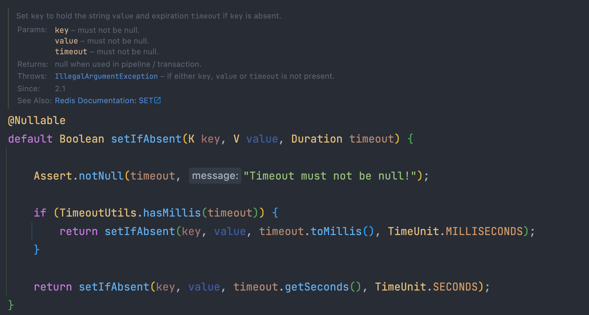 setIfAbsent는 메서드 이름에서 알 수 있듯이, 해당 키가 없다면 추가하고 존재한다면 일정 시간 대기하다가 실패할 경우 false를 반환한다.