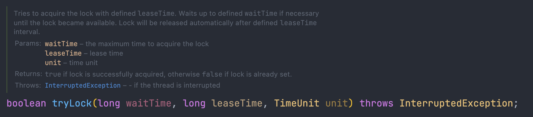waitTime은 쓰레드가 잠들지 않고 기다리는 시간이고, leaseTime은 lock을 획득한 쓰레드가 lock을 쥐고 있을 수 있는 시간을 의미한다.