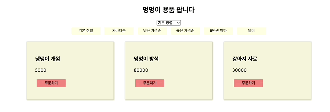 컨테이너에 있는 모든 자식 요소를 삭제한 뒤 sort 메서드를 이용하여 각각 가격별로 내림차순, 오름차순으로 정렬하고 for문에는 나름대로의 확장성을 고려하여 배열의 길이를 기준으로 반복문을 작성했습니다.