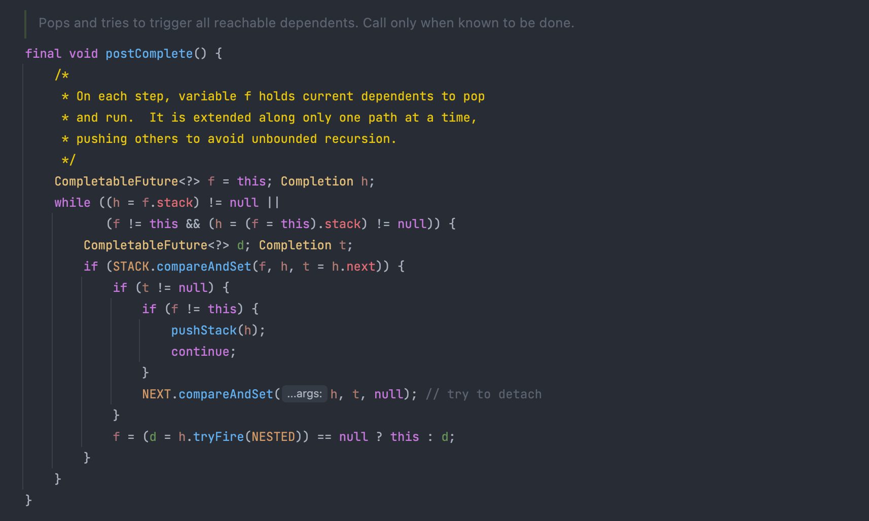 마지막으로 postComplet()에서는 내부 STACK (ColpletableFuture가 연결되어 있는 경우 종속 작업을 파악하기 위해)의 값을 compareAndSet 알고리즘을 이용해 구하고, 만약 h.tryFire(NESTED)의 결과가 null이라면 (추가적인 작업이 필요 없다면) 마지막 결과를 반환한다.