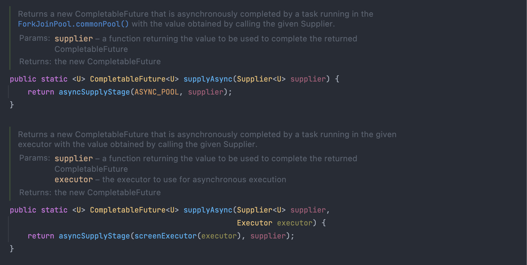 Supplier를 호출해 얻은 값으로 ForkJoinPool.commonPool()에서 실행된 결과를 비동기적으로 반환한다고 한다.