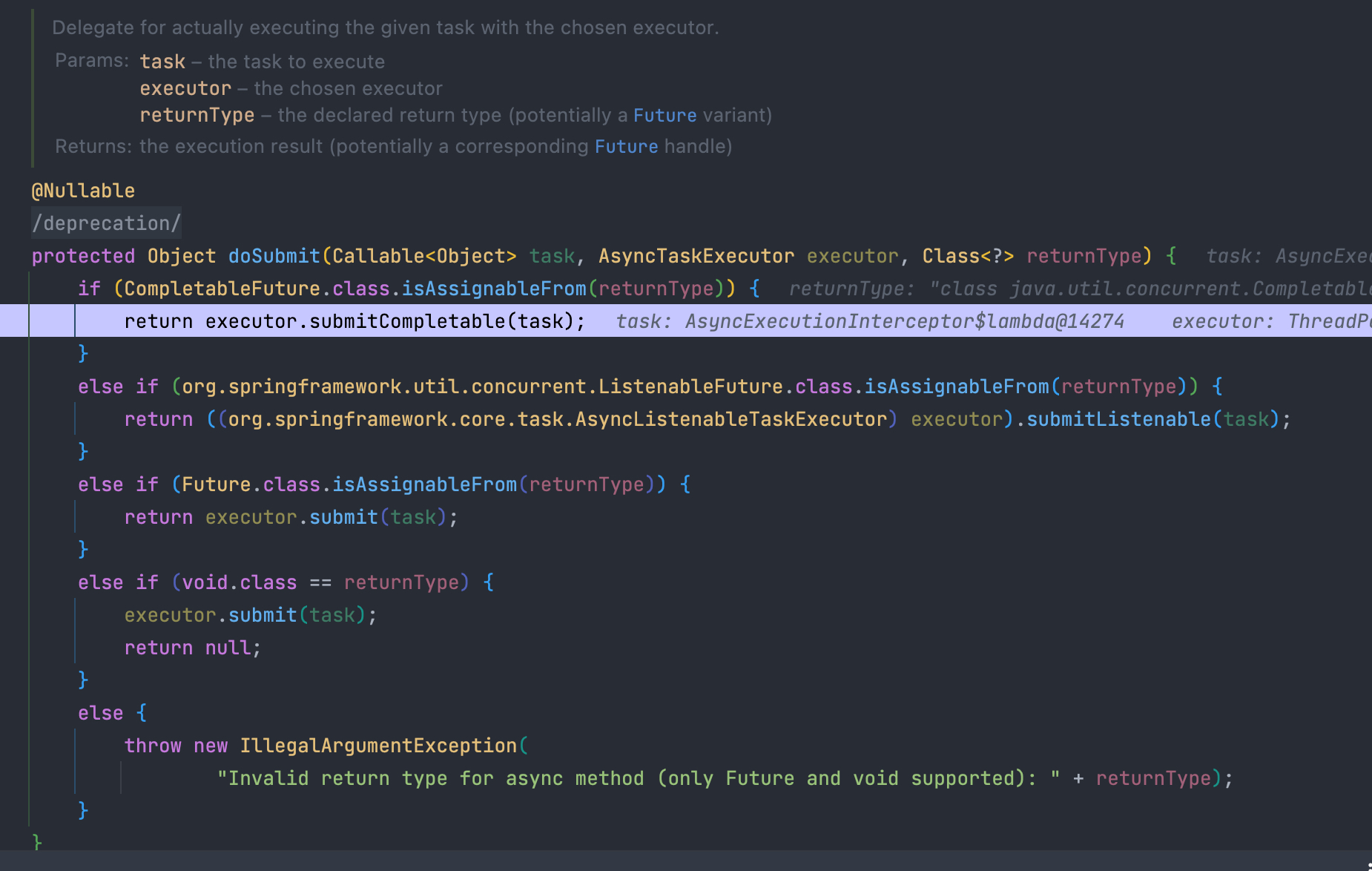 Async 어노테이션을 붙이게 되면 해당 메서드를 AsyncExecutionAspectSupport에서 실행하게 되는데 내부 구현을 따라가보면 최종적으로 completeAsync() 메서드에서 new AsyncSupply()를 실행하고 있는 것을 확인할 수 있다.