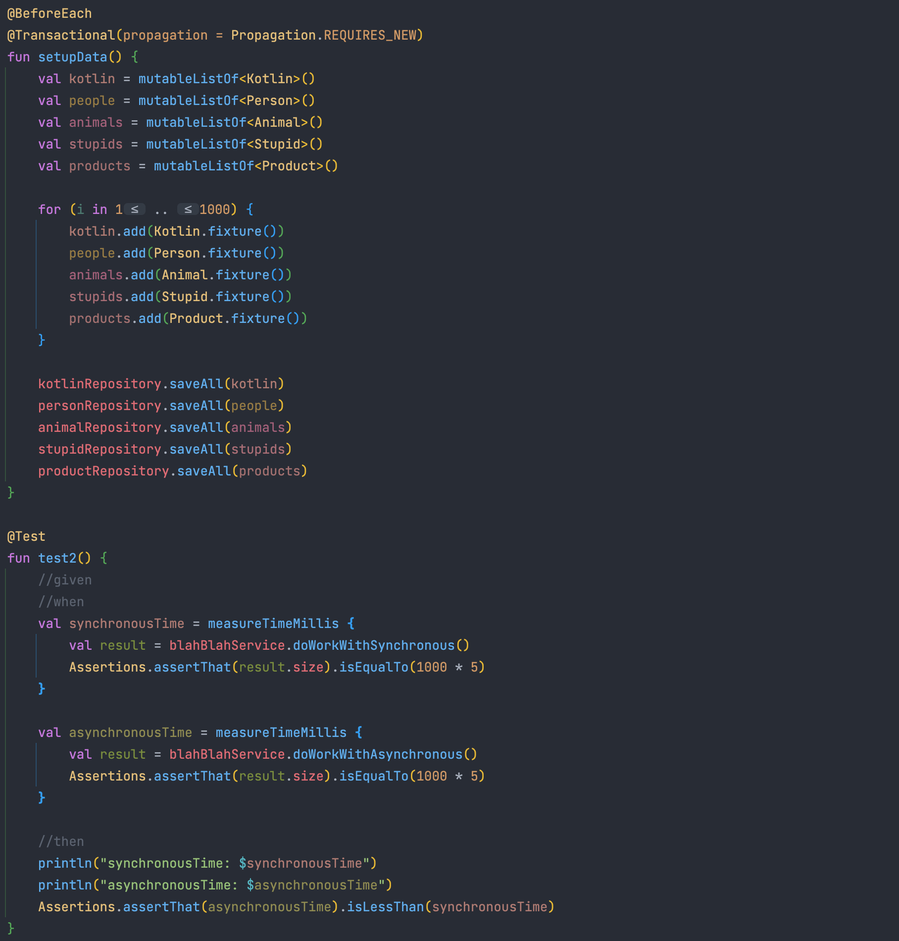 비동기 로직이 포함된 메서드를 테스트 시 주의할 점이 있는데, 데이터를 삽입하는 트랜잭션과 테스트 트랜잭션을 격리해줘야 한다.