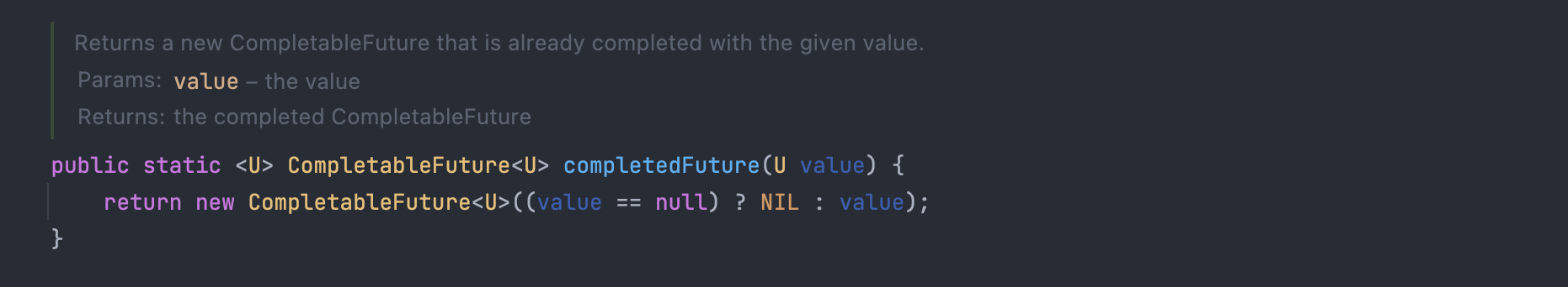 일반적인 웹/앱서비스에서 병렬 처리를 사용하는 경우는 대부분 외부 API 호출이나 쿼리 결과를 받아와서 결과만 비동기로 전달하는 것이기 때문에 completedFuture()로 완료된 동기 작업을 CompletableFuture로 래핑해서 내보내주기만 하면 되는 것..
