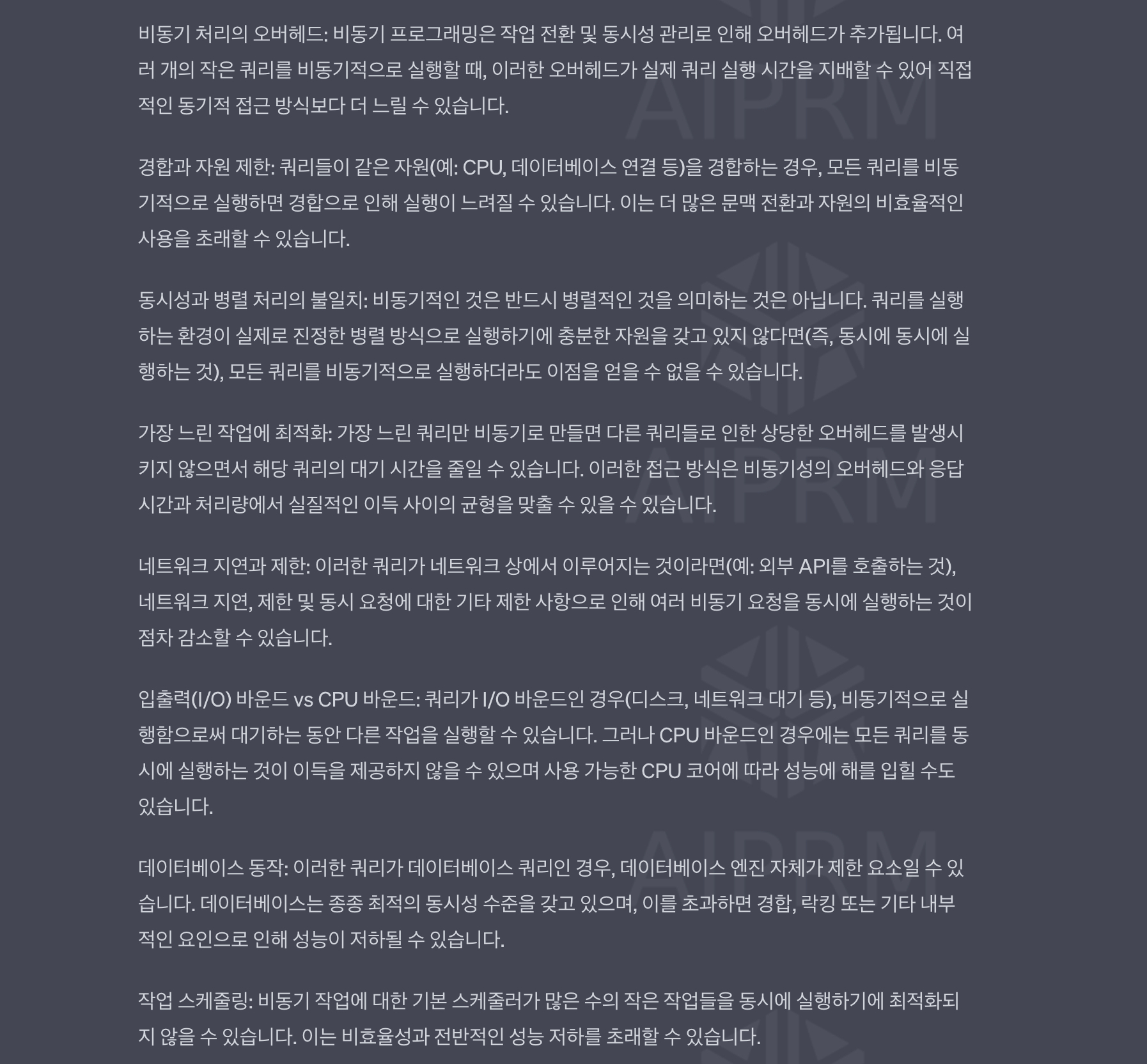 그래서 결론만 말하자면 우리 회사 서비스 기준 모든 쿼리를 비동기로 처리할 경우 오히려 더 느린 성능을 보였고, 가장 무거운 하나의 쿼리만 비동기 처리했을 때 더 빠른 성능을 보여줬다.