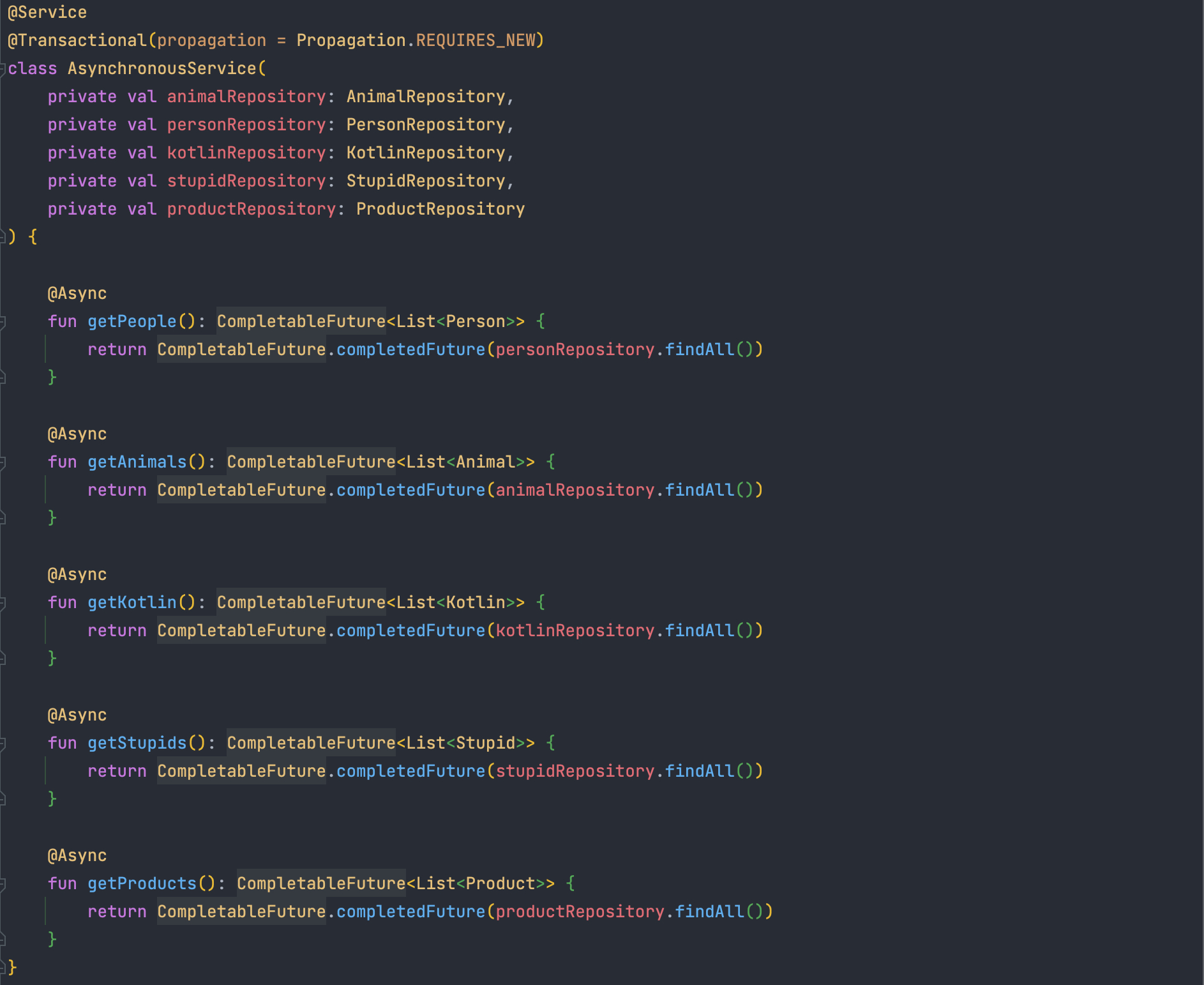 근데 사실 위에서 사용한 방법은 순수 Kotlin이나 Java로 병럴 처리할 때 사용하는 방법이고, 스프링에는 @Async라는 어노테이션이 있어서 supplyAsync()를 직접 사용할 일은 잘 없다.