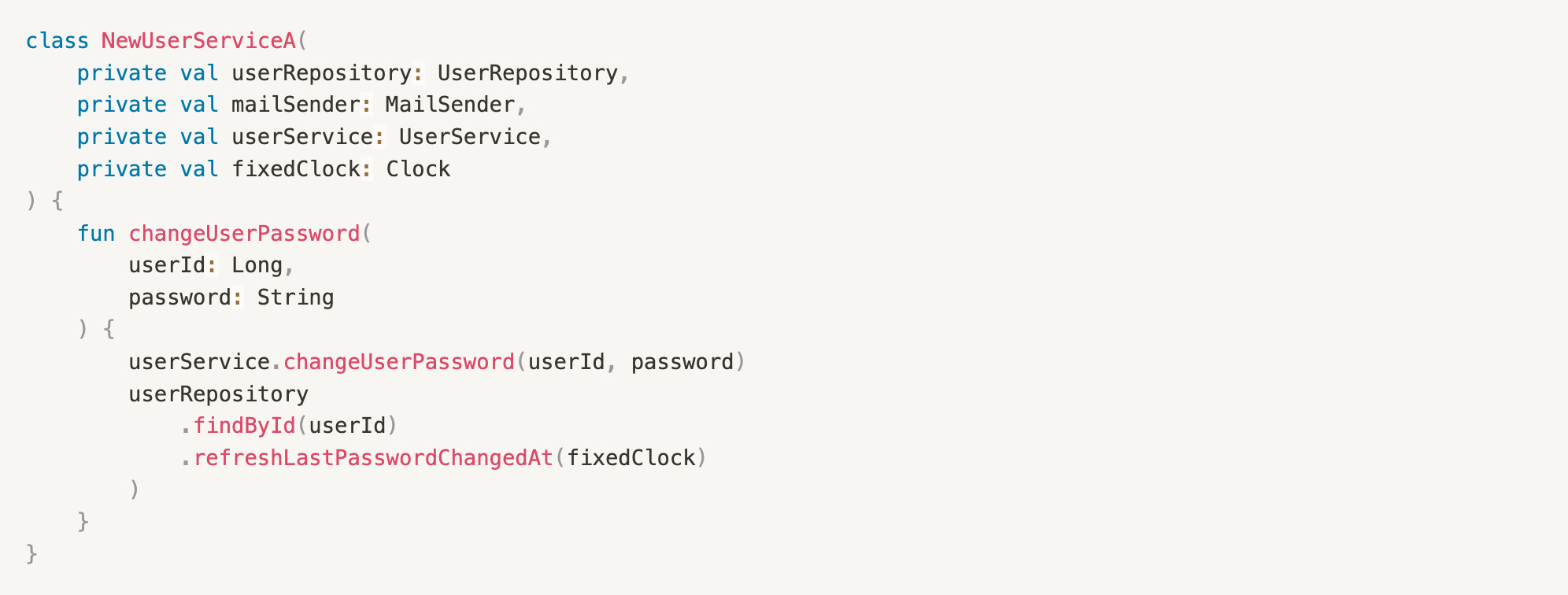 위 사례는 기존 userService의 (엄청나게 복잡하다고 가정하자) changeUserPassword라는 메서드를 호출한 뒤 추가적으로 lastPasswordChangedAt에 새로운 값을 할당해주는 로직이다.