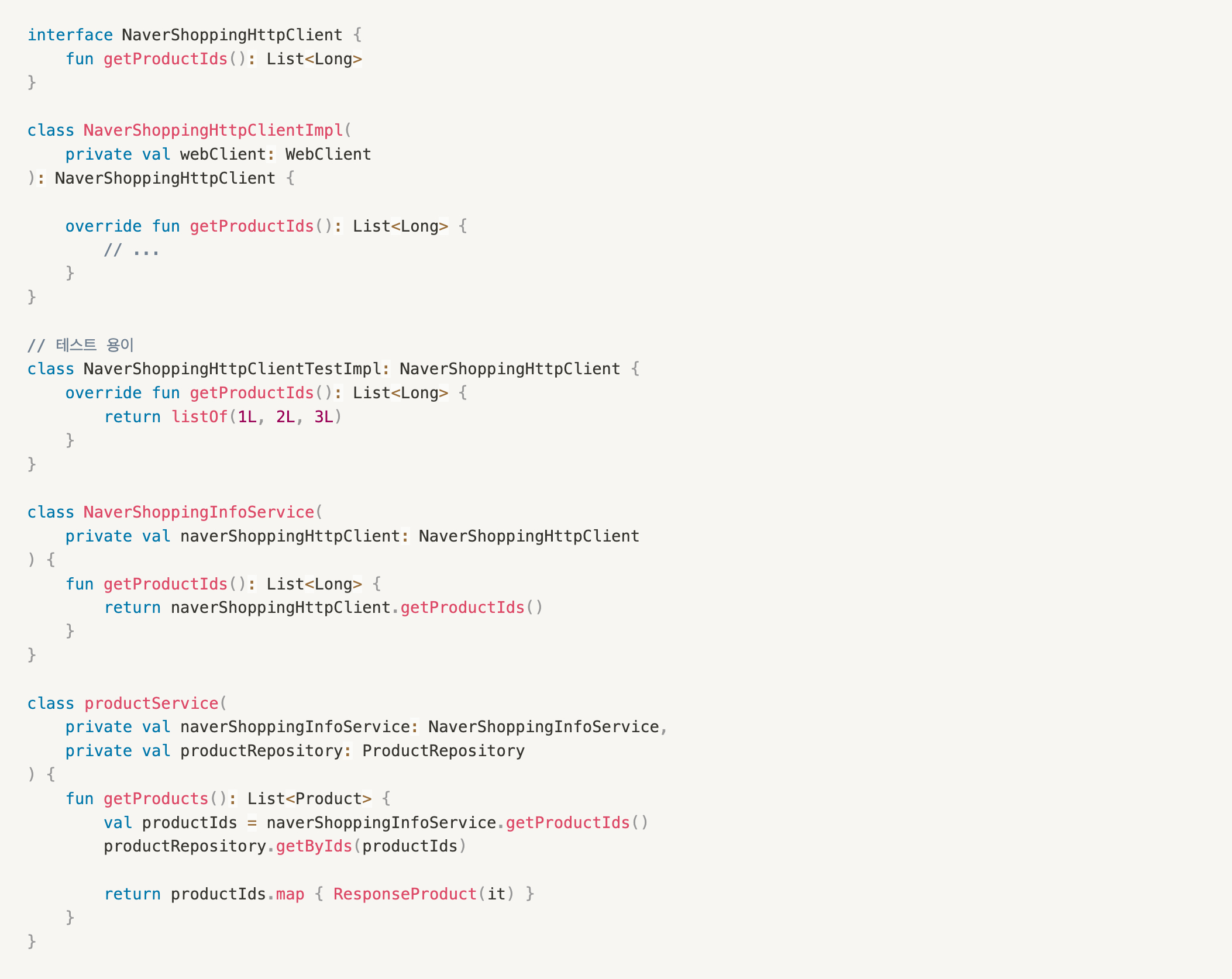 아래는 Naver Shopping Api(가상의) 호출을 위한 WebClient를 사용하는 직접적인 구현은 Infrastructure layer로 분리하고, 추상화된 NaverShoppingHttpClient만 Service Layer에 배치함으로써 외부 라이브러리에 대한 의존성을 분리하고 테스트 용이성까지 챙길 수 있는 사례이다.