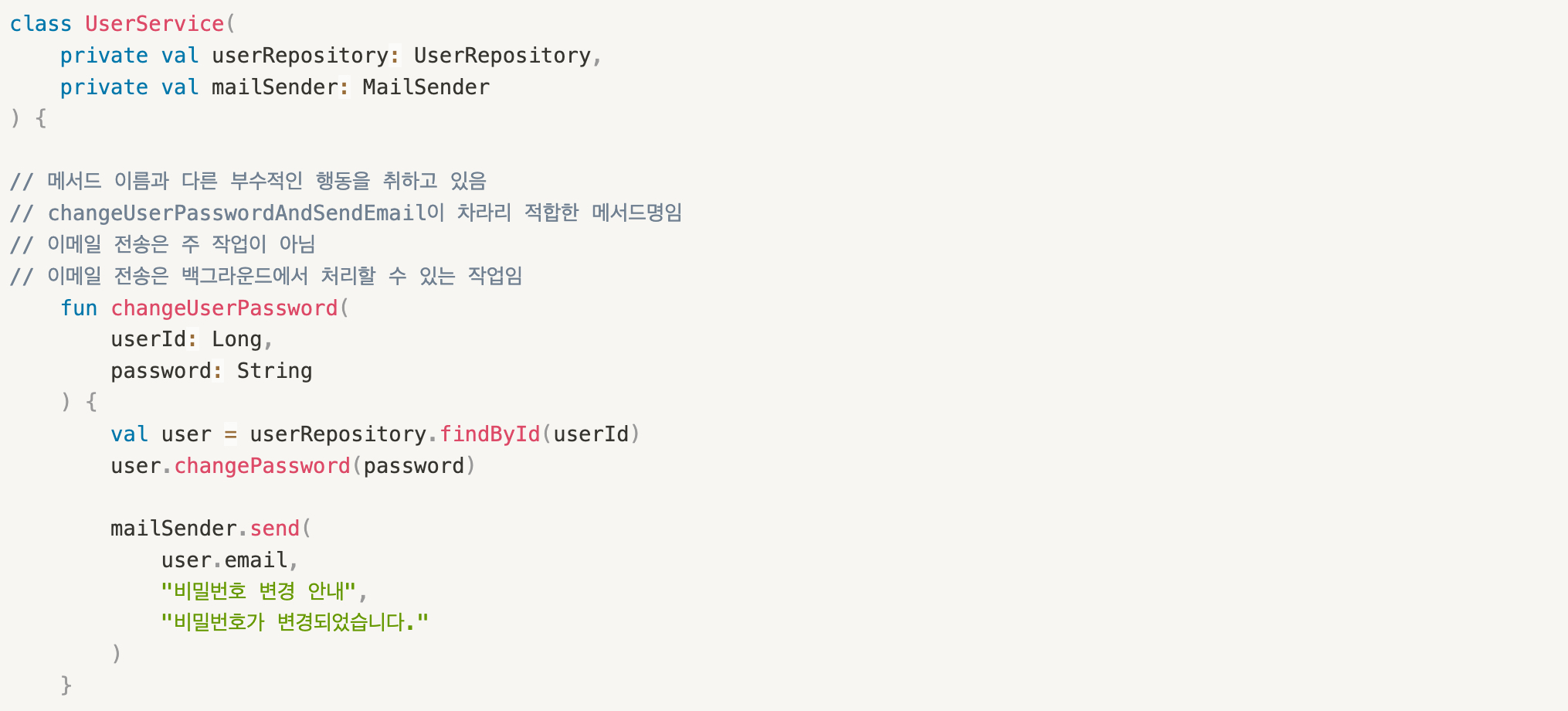 따라서 changeUserPasswordAndSendNotificationMail같은 메서드로 명칭을 바꾸는 방법도 생각해볼 수 있겠지만, 애초에 메일을 전송하는 것은 해당 메서드를 사용하는 클라이언트의 주요 관심사가 아니다.