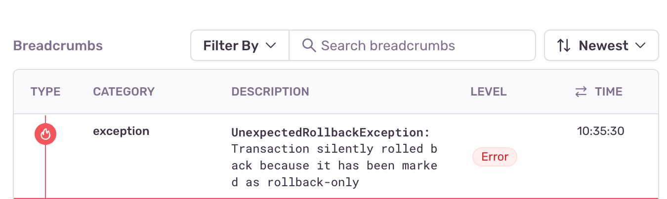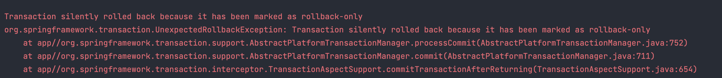 Transaction silently rolled back because it has been marked as rollback-only org.springframework.transaction.UnexpectedRollbackException: Transaction silently rolled back because it has been marked as rollback-only at app//org.springframework.transaction.support.AbstractPlatformTransactionManager.processCommit(AbstractPlatformTransactionManager.java:752) at app//org.springframework.transaction.support.AbstractPlatformTransactionManager.commit(AbstractPlatformTransactionManager.java:711)