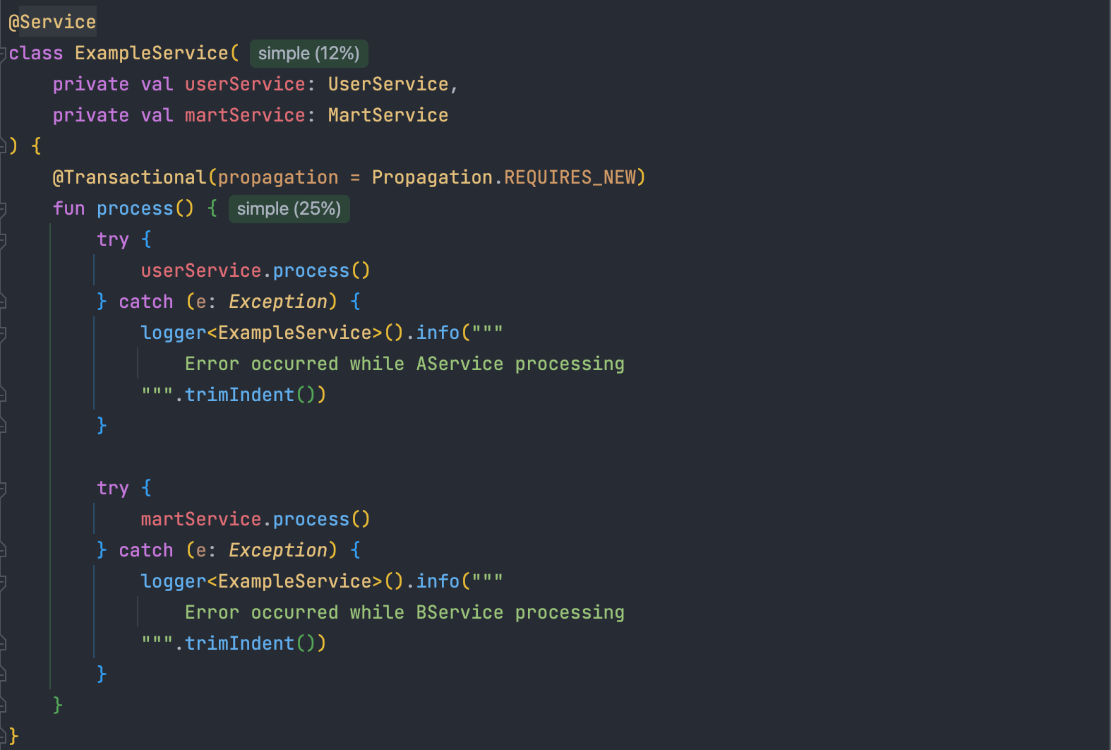 ExampleService는 AService, BService의 process()를 각각 호출한다.