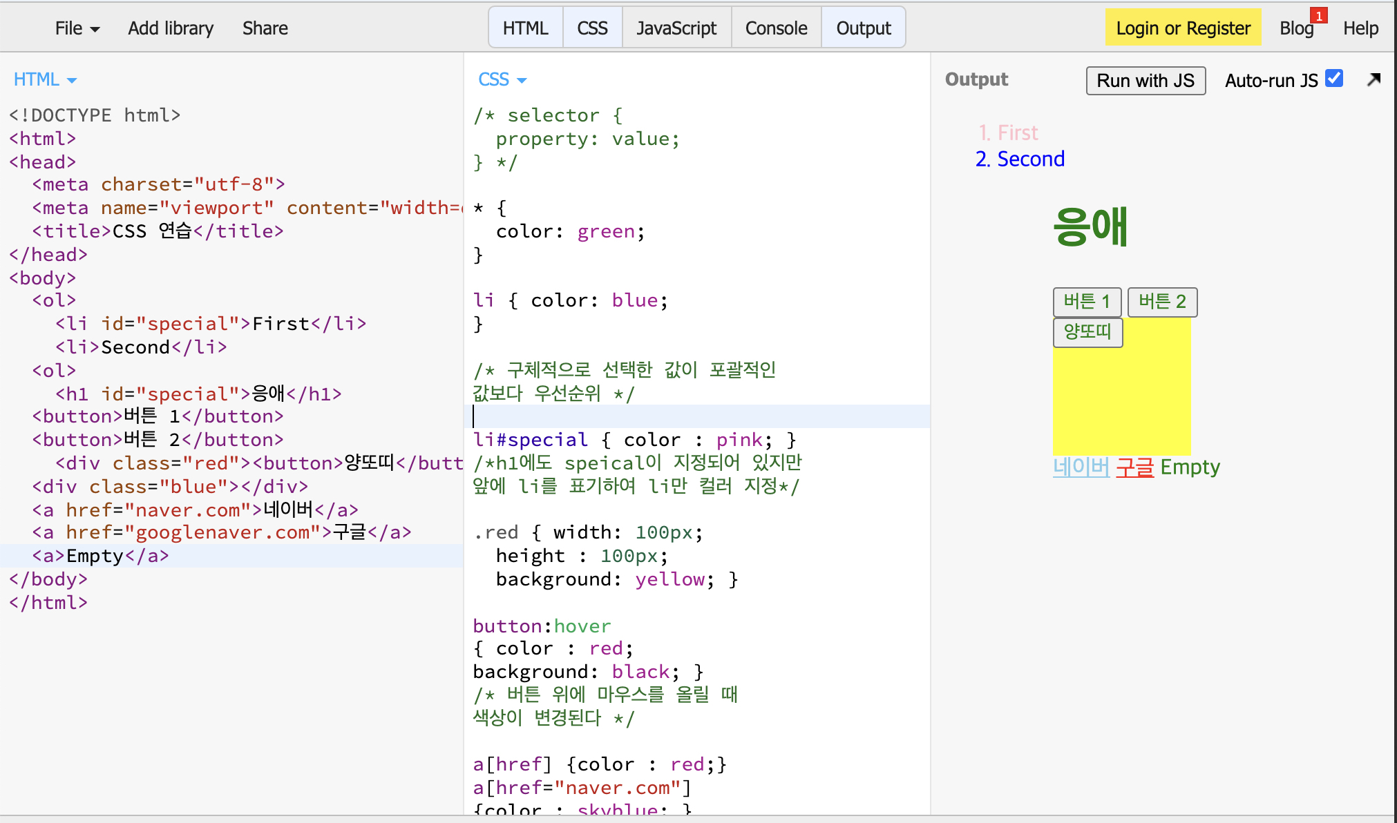 여러 선택자가 한 요소에 대해 다른 값을 지정하고 있을 경우 포괄적인 값보다 구체적인 값을 우선, 먼저 설정한 값보다 나중에 설정한 값을 우선으로 적용한다.